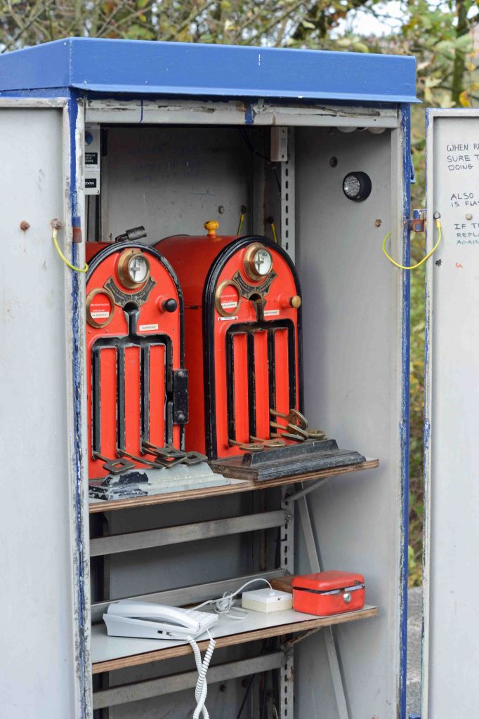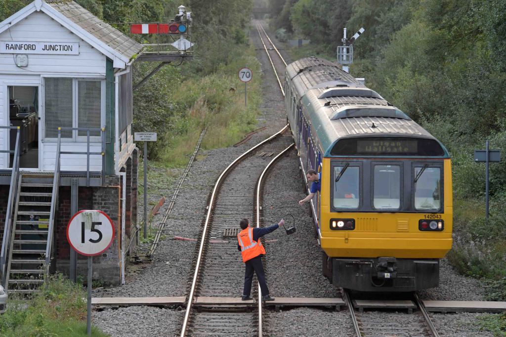 The Signaller at Rainford Junction on the Kirby-Wigan line collects the single-line token from the Driver of a Wigan bound train. Kept in leather bags on the end of a metal loop these tokens are the authority to proceed for a train to travel over the single-track line from Rainford to Kirby. This form of train control is known as Absolute Block, only allowing one train onto a section of track at a time. There are fewer and fewer locations where you can see this happen due to signalboxes being abolished with token equipment being relocated to anonymous metal cabinets on station platforms which are opened by the train Driver, who uses a telephone to contact the nearest signalbox (which may be many miles away) in order to get the token released. Here’s an example. This is at Battersby in North Yorkshire.