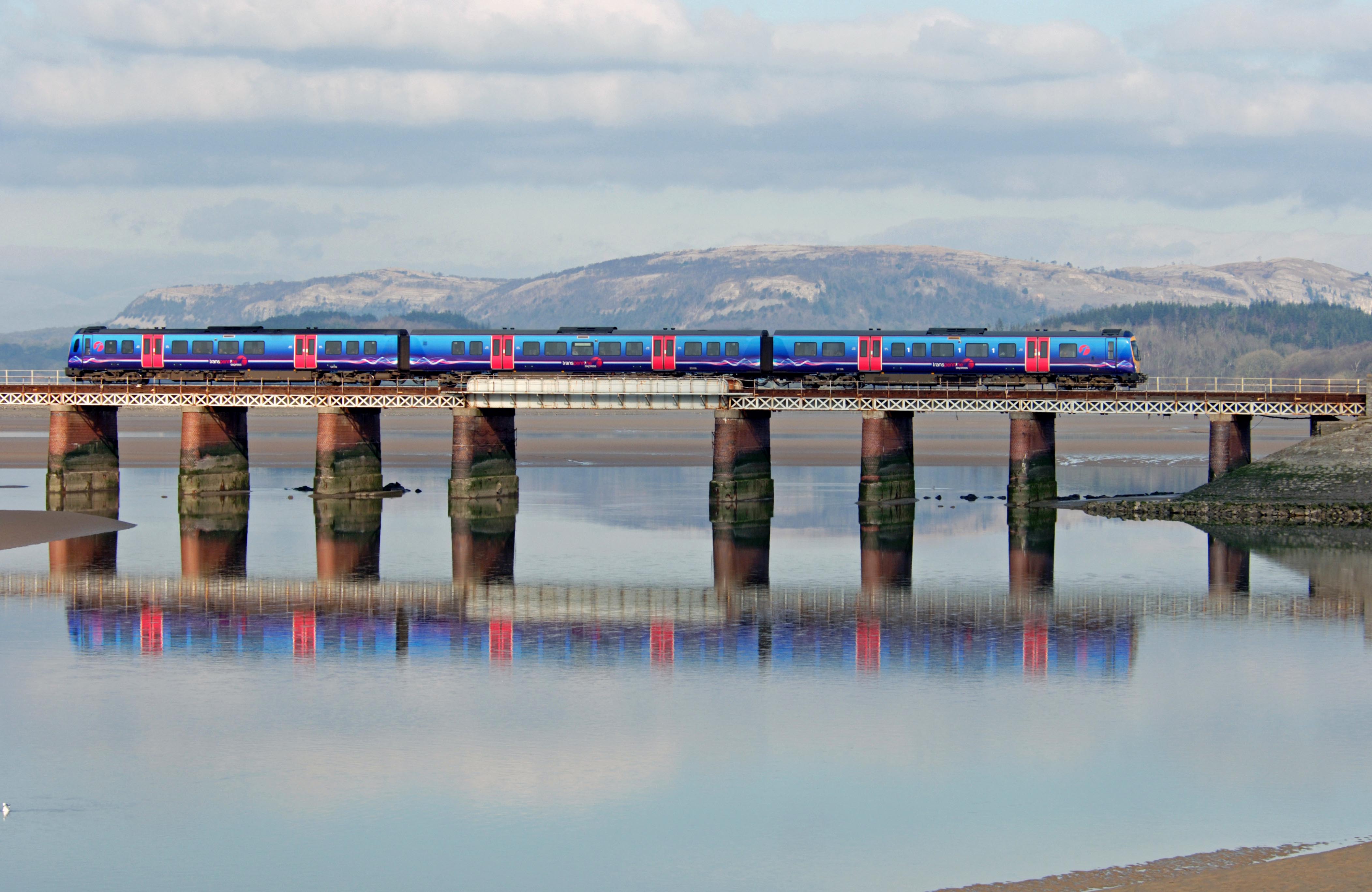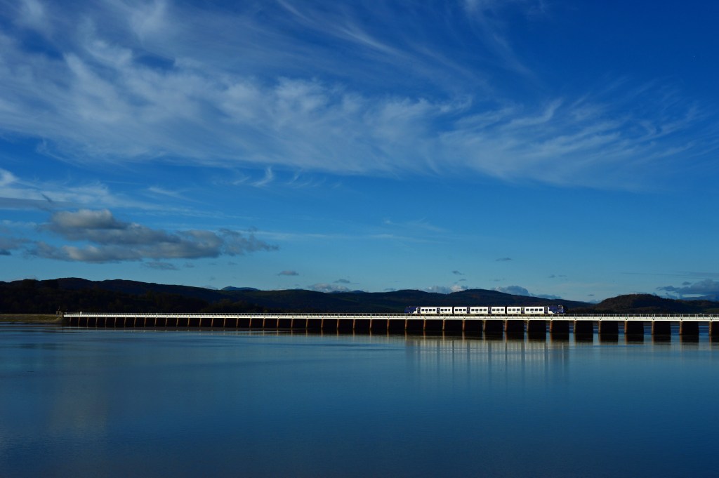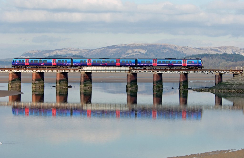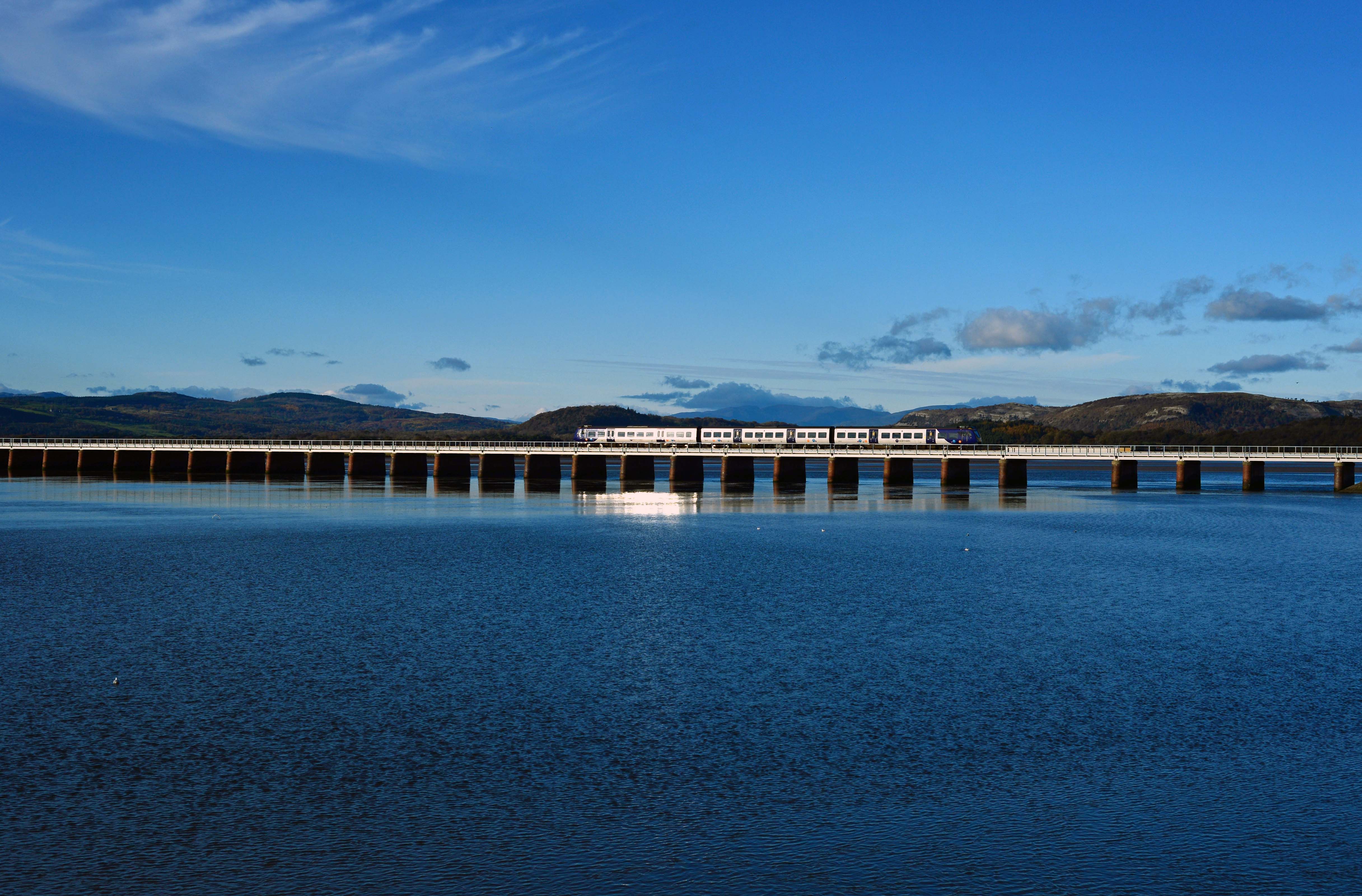 195103 works 1U97, the 13:52 Barrow-in-Furness to Manchester Airport across the Arnside viaduct.