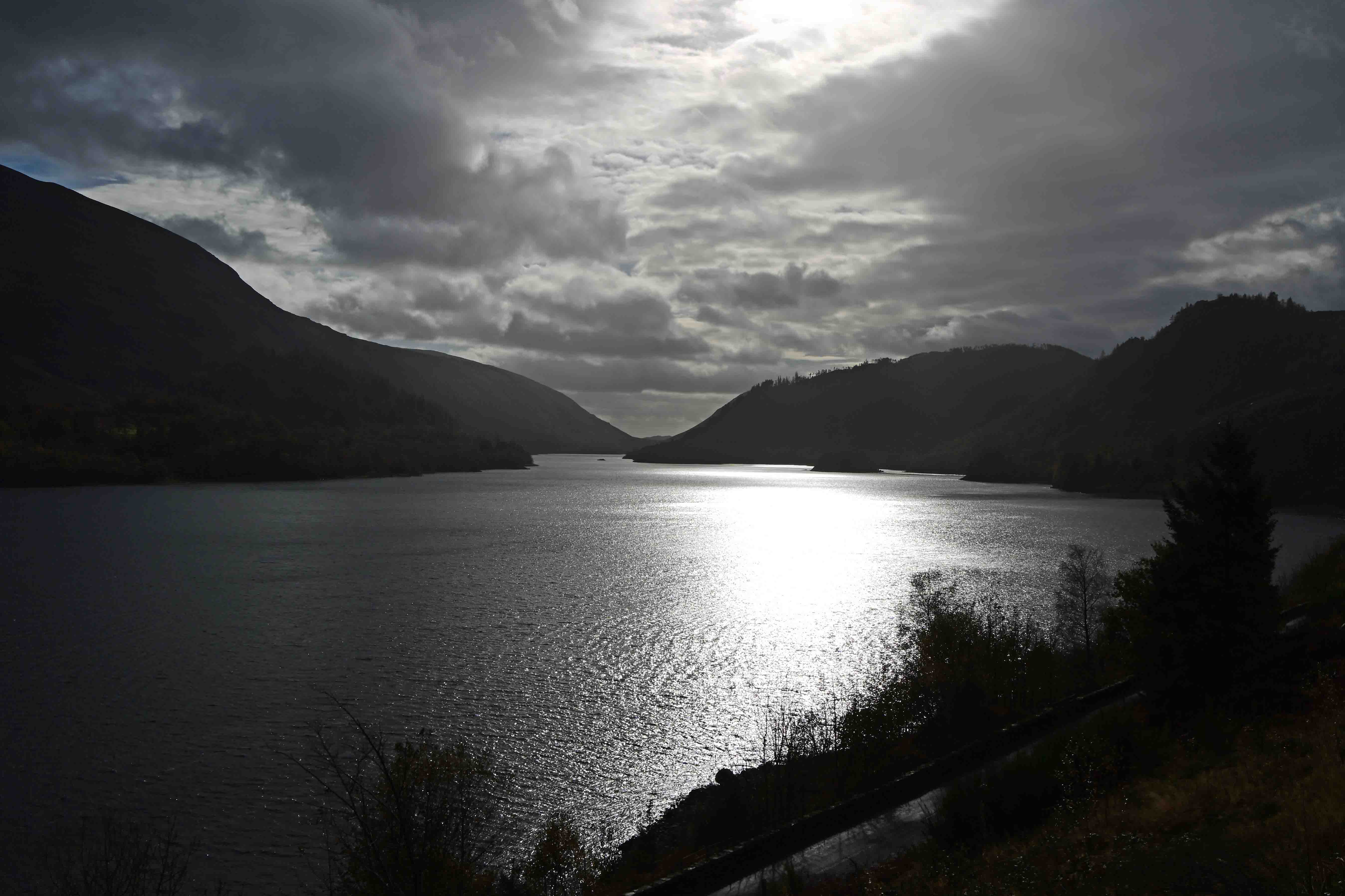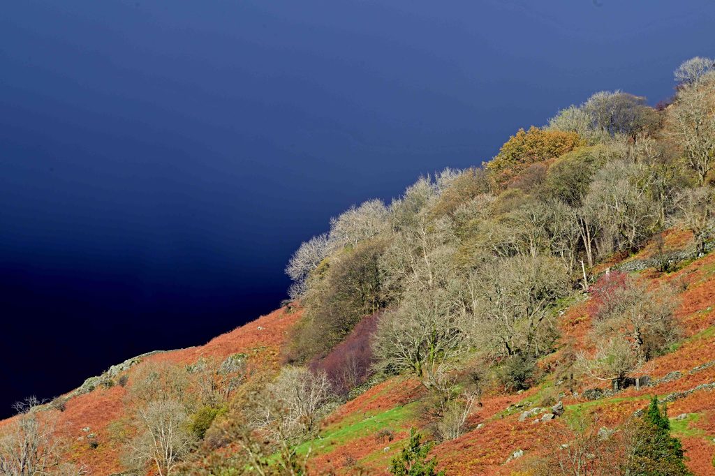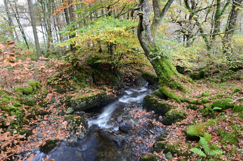 Instead, today’s been just another birthday, although I don’t mean to make that sound bad, or ungrateful. Dawn’s done a fantastic job in arranging things which we’ve both enjoyed. The weather here in the Lake District was predicted to be mixed today so we were up bright and early in order to make the most of the conditions. That meant an 08:30 breakfast, after which we headed North through Windermere and Ambleside to Thirlmere. The amount of traffic on the road through Ambleside meant the trip took far longer than it should, but once we were past that bottleneck things eased. Taking the road on the West side of Thirlmere eased us out of more traffic and let us enjoy some lovely lakeside sights like this as the trees shed their multicoloured leaves around streams filling the lake.