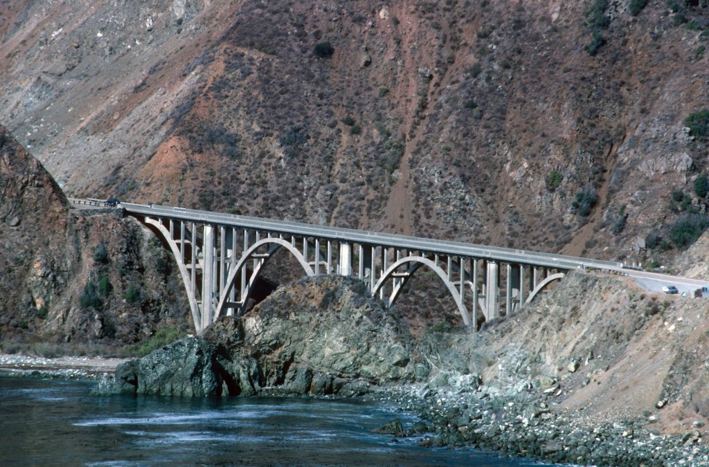 Opened in 1938, this graceful bridge is a 589 feet long, 24 feet wide open spandrel, concrete deck arch structure designed by Christian Theophil Gutleben. Each span is 178 feet wide and 65 feet above ground level. It’s quite an impressive sight when you first glimpse it as you approach along the coast from the South, but then the California coast road is a lovely route with several similar structures. There parking places at either end so that you can stop, admire the bridge, sea or cliffs and take photographs.