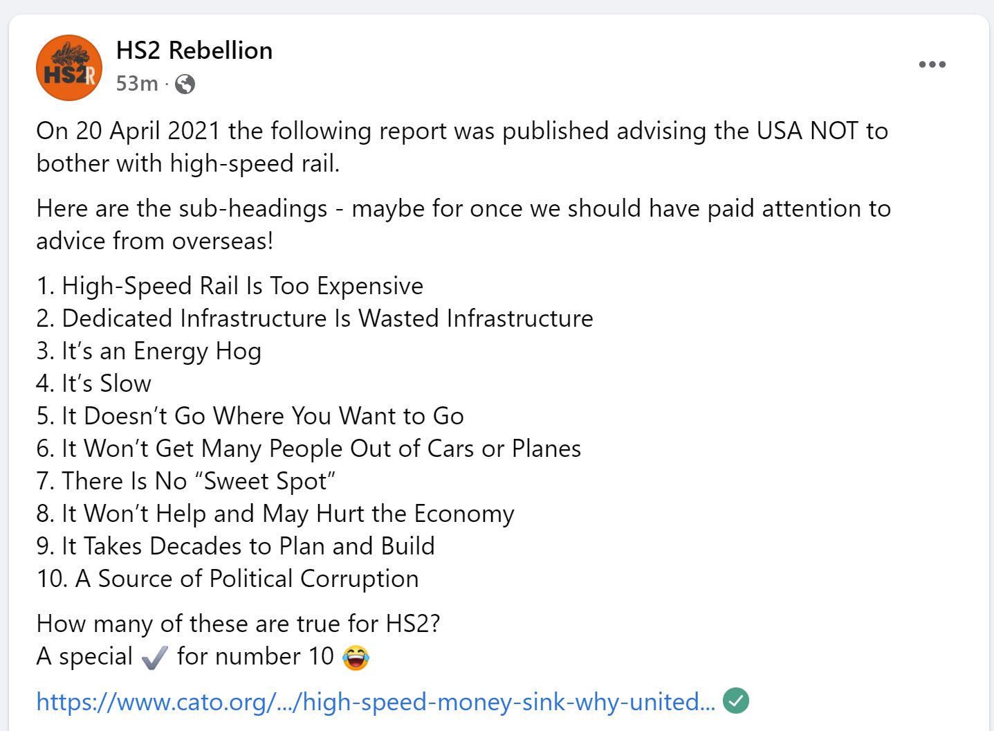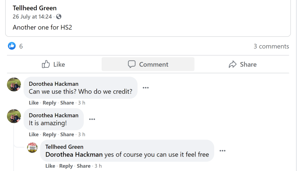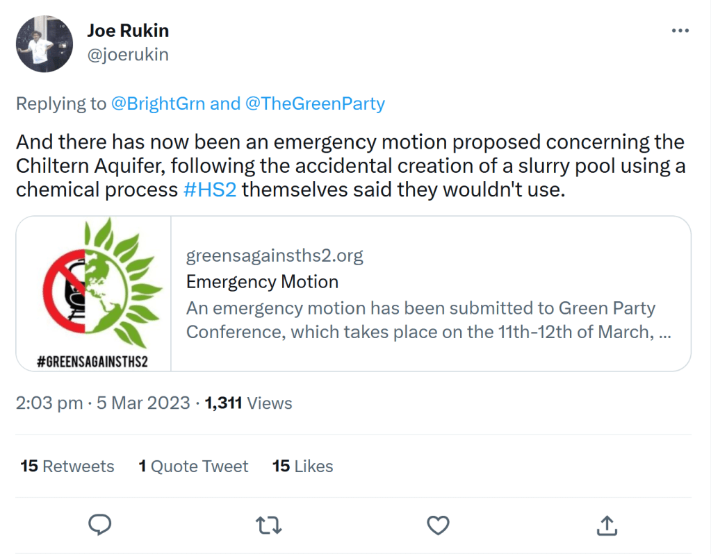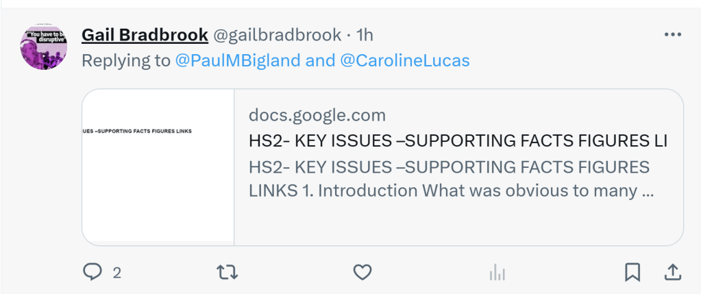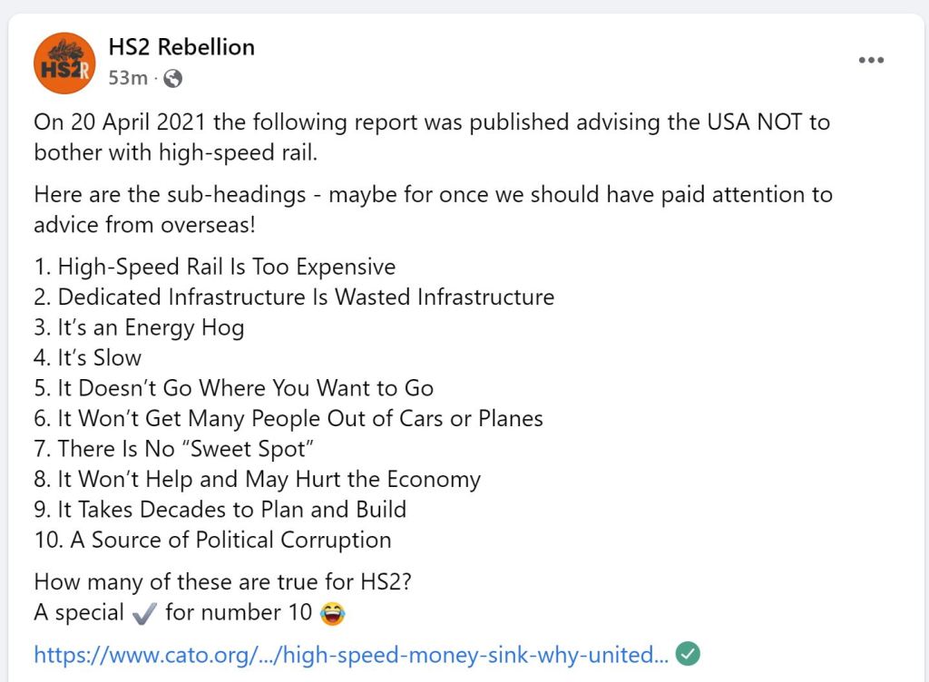 This is a link to an anonymous document with no provenance and no names on it to say who compiled it. Called ‘supporting facts and figures’ it’s essentially a cut and paste job a list of cobbled together reasons and ‘evidence’ of why ‘greens’ should oppose HS2. It’s a litany of lies, discredited claims and things that never, ever happened, including the classic that “HS2 is the largest deforestation exercise in the UK in over 100 years, not since WWI has the UK cut down so many trees”. I skewered that one here back in 2019!