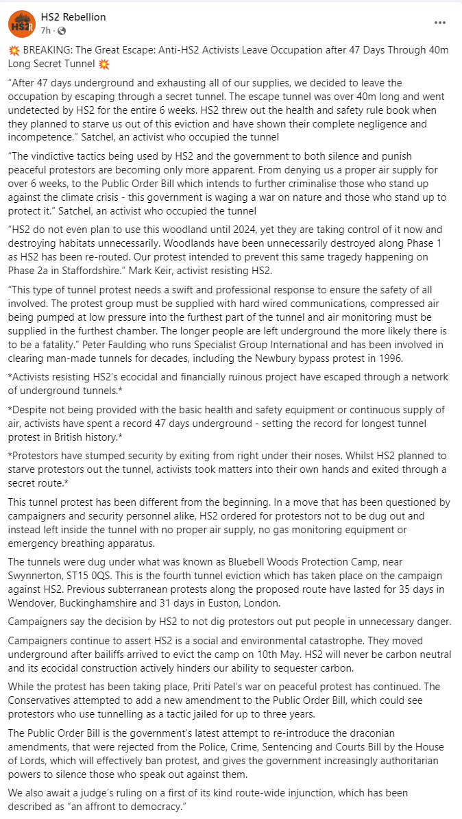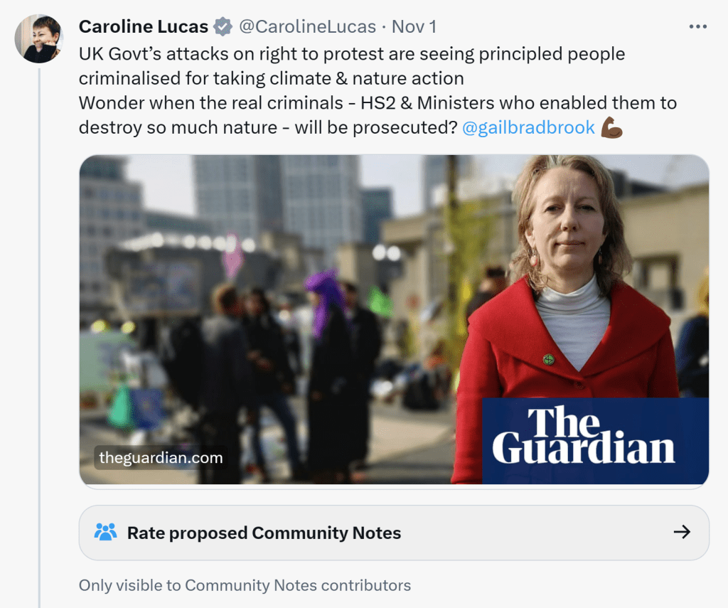 Where to start? Was Bradbrook convicted of protesting? No. She was convicted of criminal damage, for smashing a plate glass window in protest against the building of HS2! Yep, protesting against building a new railway! Not a road, not a motorway – a railway! Criminal damage is NOT covered by article 11 of the ECHR law. It is NOT a ‘peaceful protest’ – it’s criminal damage. That some ‘greens’ simply can’t get their heads around that because of their exceptionalism is just another reason I have little time for them.