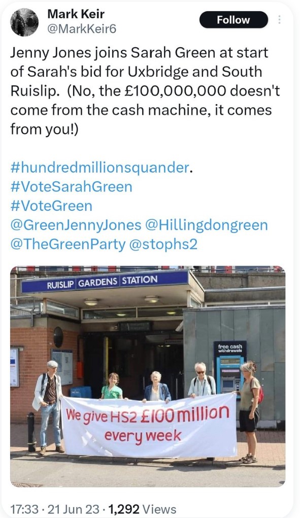 This rattled Bradbrook’s cage, as she responded with two tweets, both of which sent my irony meter off the scale! The first quotes the Times newspaper and its recent attempts to fly air-cover for Sunak and the Tories by rehashing old claims of corruption with HS2 Ltd as a way of diverting attention from the mess they’ve got themselves into by cancelling parts of HS2. Never forget, who had oversight and control of HS2 Ltd? The Government. But, a founder of XR? Using a Murdoch-owned newspaper as ‘evidence’? Bless! However, it was this tweet that was the most interesting.