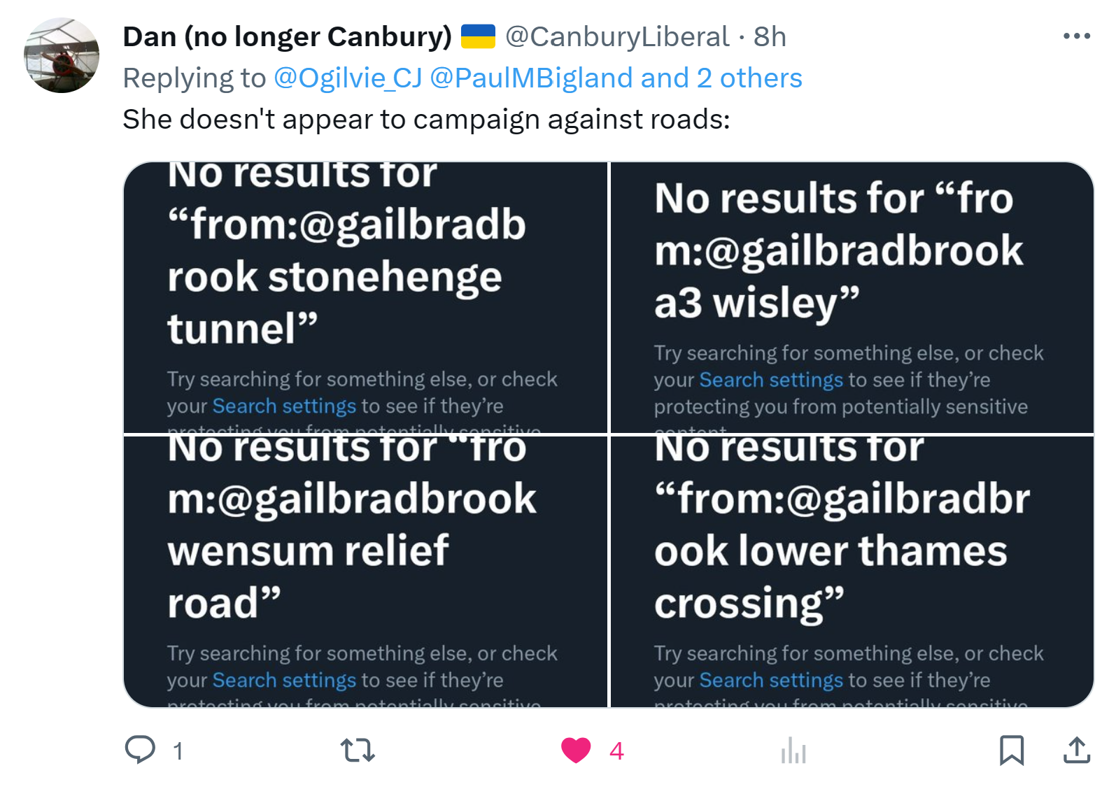 Still, I’m sure Bradbrook spends even more of her time campaigning and Tweeting about the 1000s of miles of new roads the Tories are planning to build, doesn’t she? Oh, wait. @CanburyLiberal did a search on Twitter and found this. Nada, zilch, zip, SFA…