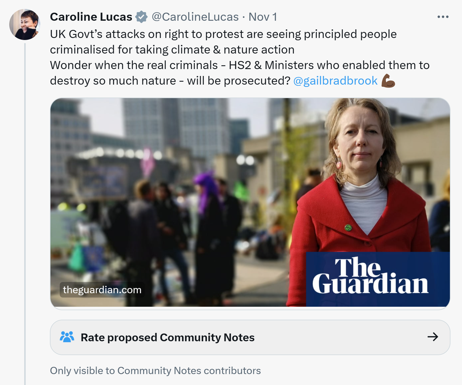 Yesterday, their outgoing MP for Brighton, Caroline Lucas tweeted this load of tosh whilst linking to a Guardian article on the trial and conviction of Gail Bradbrook, one of the co-founders of ‘Extinction Rebellion’.