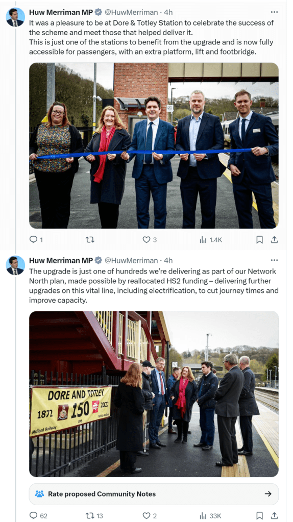 Claiming this is a ‘Network North’ project is complete bollocks. A fag packet would be embarrassed to have had this so-called plan drawn up on it. A ‘plan’ which dates from November 2023 – when Rishi Sunak unilaterally decided to cancel HS2 phases 2a and 2b. Y’know – the bits that were meant to deliver ‘levelling up’. The claim that this fictional money (which wasn’t due to be borrowed until 2029) has funded a project started in 2021 shows how Merriman and his boss (Sunak) are gaslighting people – and how Merriman is happy to promulgate a lie. Yeah, I know – he’ll pull the usual pained face he does when he’s caught out. But make no mistake, this is a lie.