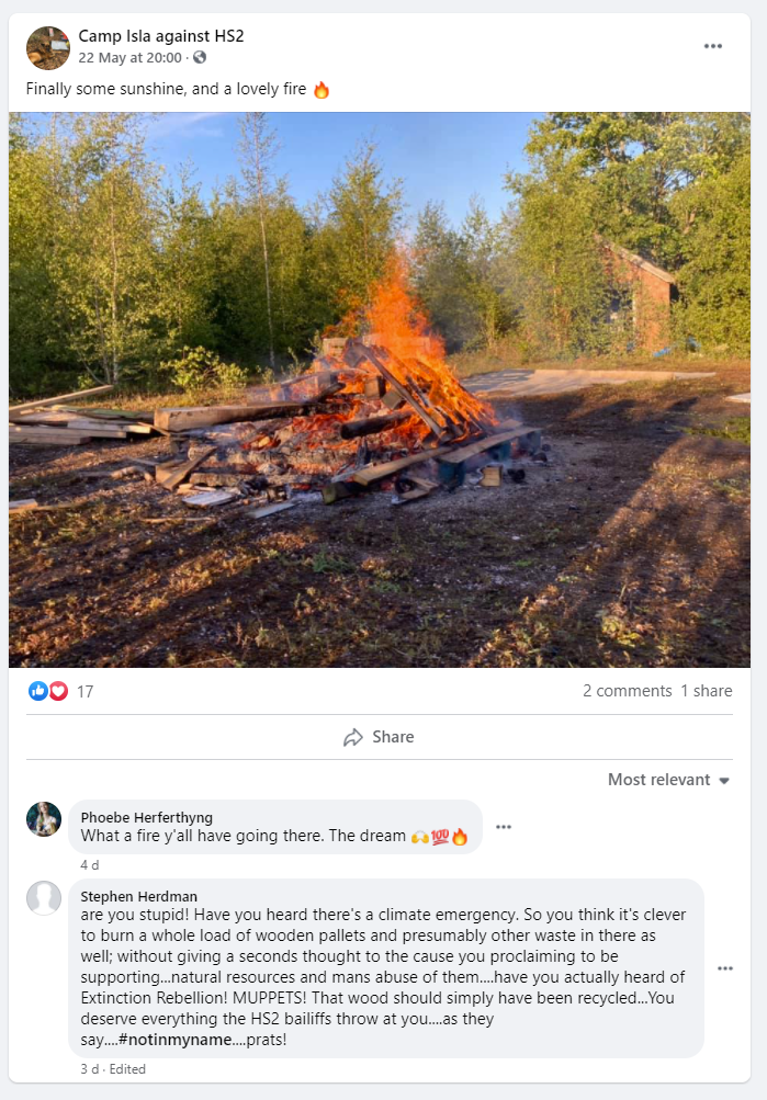 Whatever these people are – ‘environmentalists’ they ain’t. They leave a trail of destruction and pollution wherever they go, be it destroying the ecology of pristine chalk streams, sullying woodlands with sewage and other detritus or driving hundreds of miles in old cars – or pulling stunts like this by burning rather than recycling timber from a camp they were being evicted from. Even one of their followers lost it with them over this!