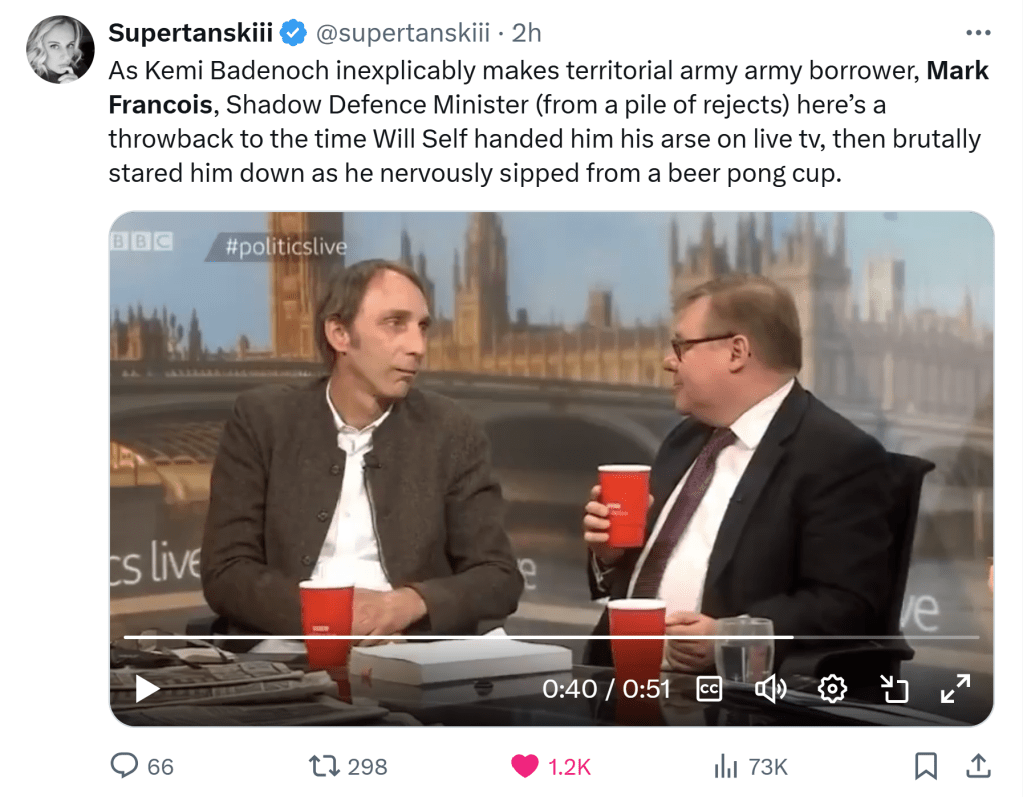 Then she went on to choose her shadow cabinet (shouldn’t that be shallow cabinet? Ed), most of which have been announced today. Admittedly, after their electoral decimation the talent pool has become a puddle, plus many experienced Tory MPs are keeping their powder dry so that they’re not tainted by Badenoch’s failure when it happens and can step into the breech. So, who did she choose? The one that’s outstanding for me is ‘Penfold’, sorry Mark Francois, the MP (although why is a mystery) for Rayleigh and Wickford, a man whose ego is in reverse proportion to his stature. One of the pro-Brexit fanatics and trouble-makers of the ‘European Research Group’ Badenoch has appointed this former member of the TA as….Shadow Defence Minister!