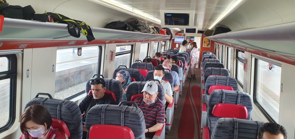 My train leaves at 13:05 and arrives in KL just over three hours later. I’ll update this blog from there. Here it is – an ETS set built by CRRC of China in 2018 but assembled in Malaysia.