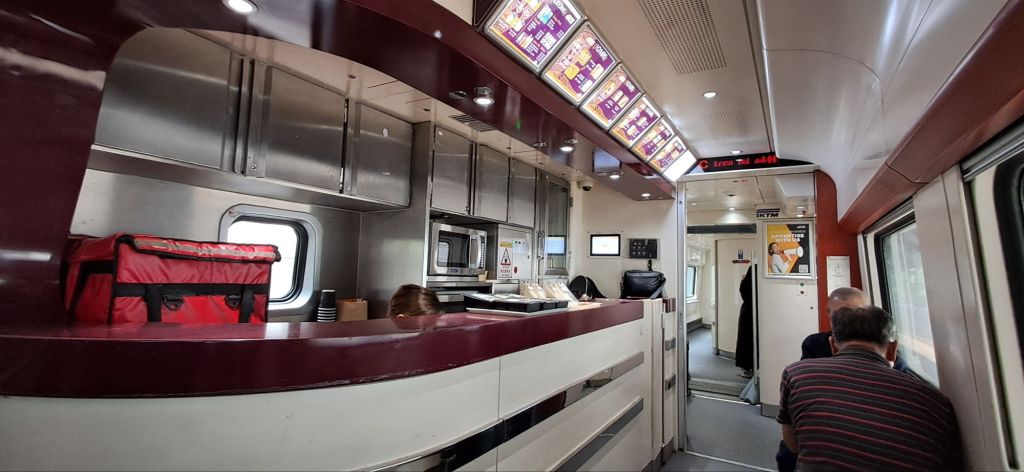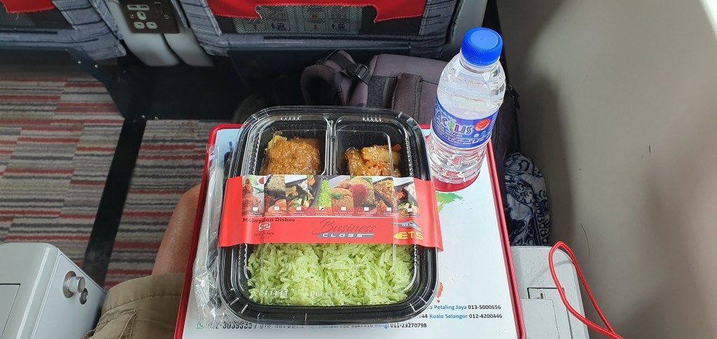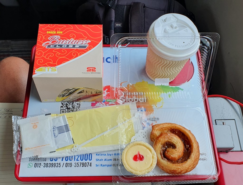 The buffet area of coach C. There’s a good selection of pre-prepared local food such as Nasi Lemak. There’s also a small selection of sandwiches for those who prefer plainer fare. Hot and cold drinks are also on the menu. There’s two small tables which seat two apiece next to the counter for those who want to linger.
