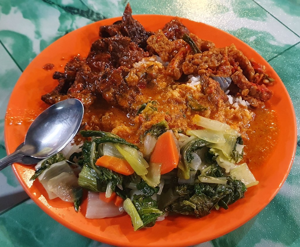 You might recognise fish. At the front is Jackfruit. Next to that is beans. Between them is a chicken’s foot – not my favourite but the sauce was lovely. At the top (just out of focus) was the stunner. Tempe with small dried fish in a spicy sauce! You can see it in all it’s glory in the picture below. It’s the 2nd from the bottom. I’ll be back for more…
