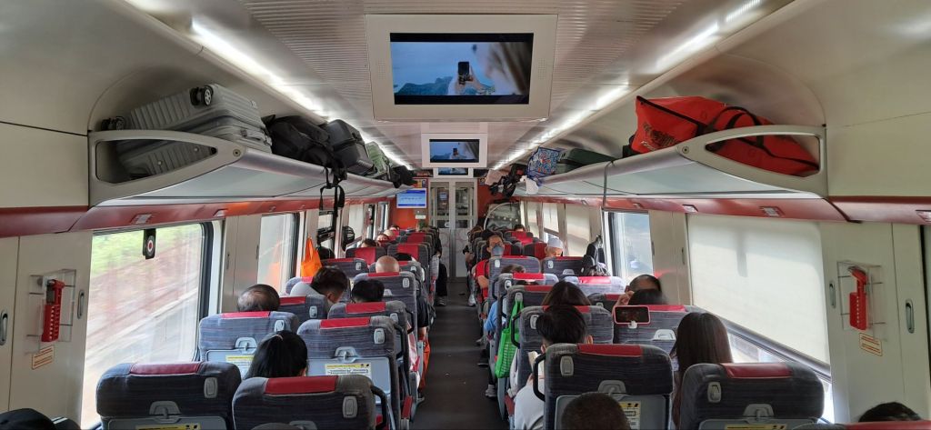 Wow! There’s working wifi aboard this ETS trainset. Well, in coach C where the buffet is – which is where I’m sat enjoying a coffee (made with coffee bags, and really rather good), checking in with the world and updating this blog. This train’s sold out. Whenever people get off en-route their seat’s been rebooked. The train’s one of the 2nd batch of ETS sets and it suffers from the same issues as earlier ones, such as blown windows that are almost impossible to see through and a lack of exterior cleaning. It’s all a bit careworn too. Even so, it can still hit over 140kph, not bad for a meter-gauge railway.