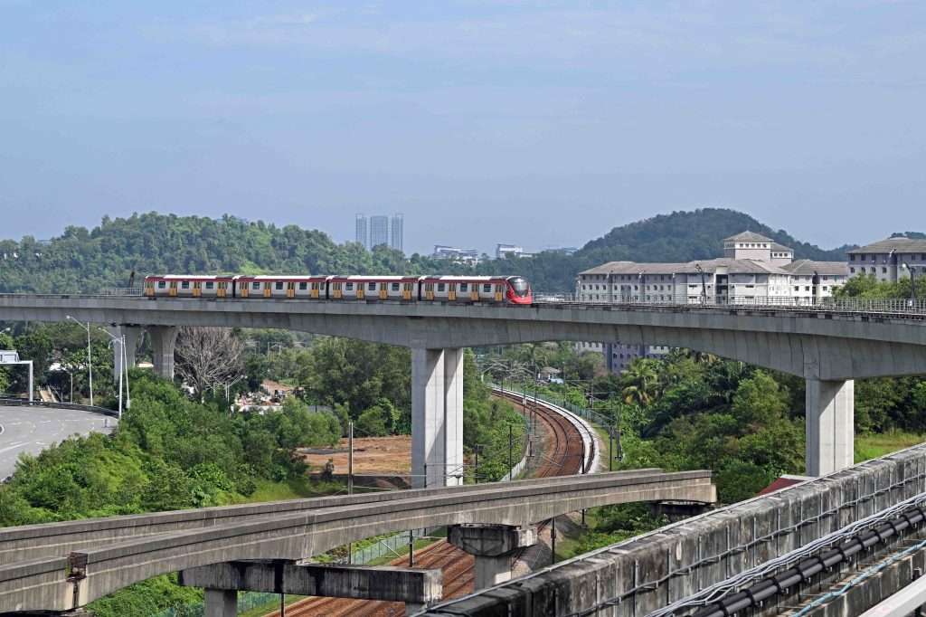 A Putrajaya MRT train crossing the KLIA airport line on its way into Putrajaya Sentral. The remains of the abandoned and never completed monorail can be seen in the middle.