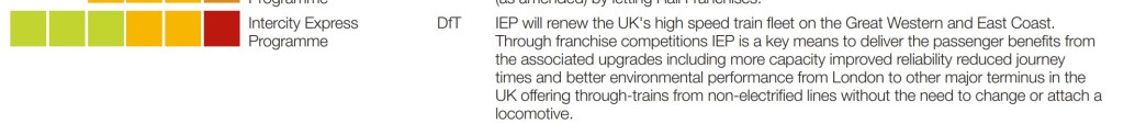 There’s another rail project that was rated Red at one time too – the Intercity Express Programme (IEP) which was the design, build and delivery of the new Hitachi train fleets known as the Class 800-802 (or ‘Azuma’ if you’re on LNER). Here’s this from page 24 of their 2018 annual report.