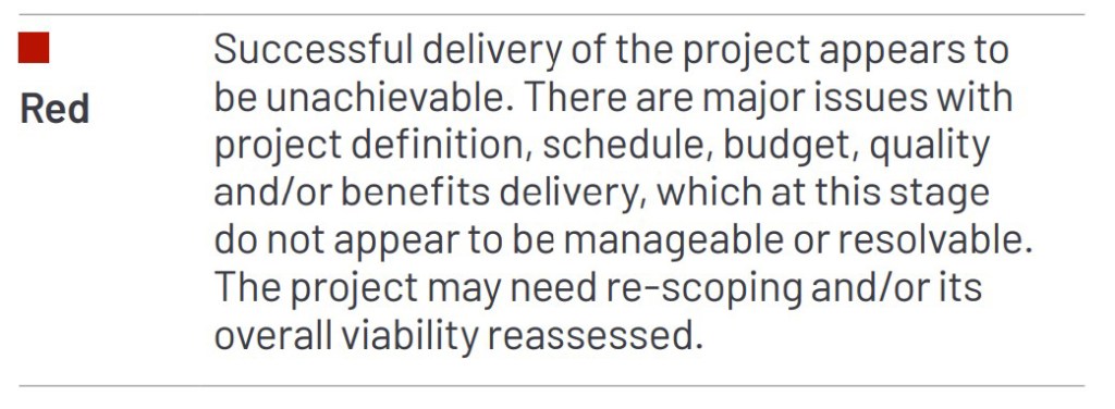 The IPA uses a colour-coded system to gauge how scheme are doing progress wise, they go from green to red. The ‘red’ rating is described thus;