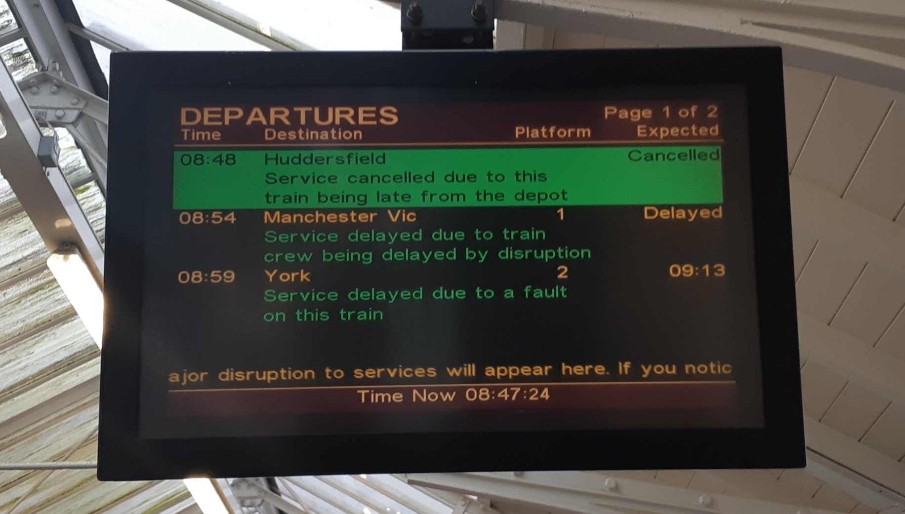 Having walked to Halifax station after a later than usual start due to the dank and dismal weather I was greeted by news of an equally dismal rail service! Here’s the PIS screen..