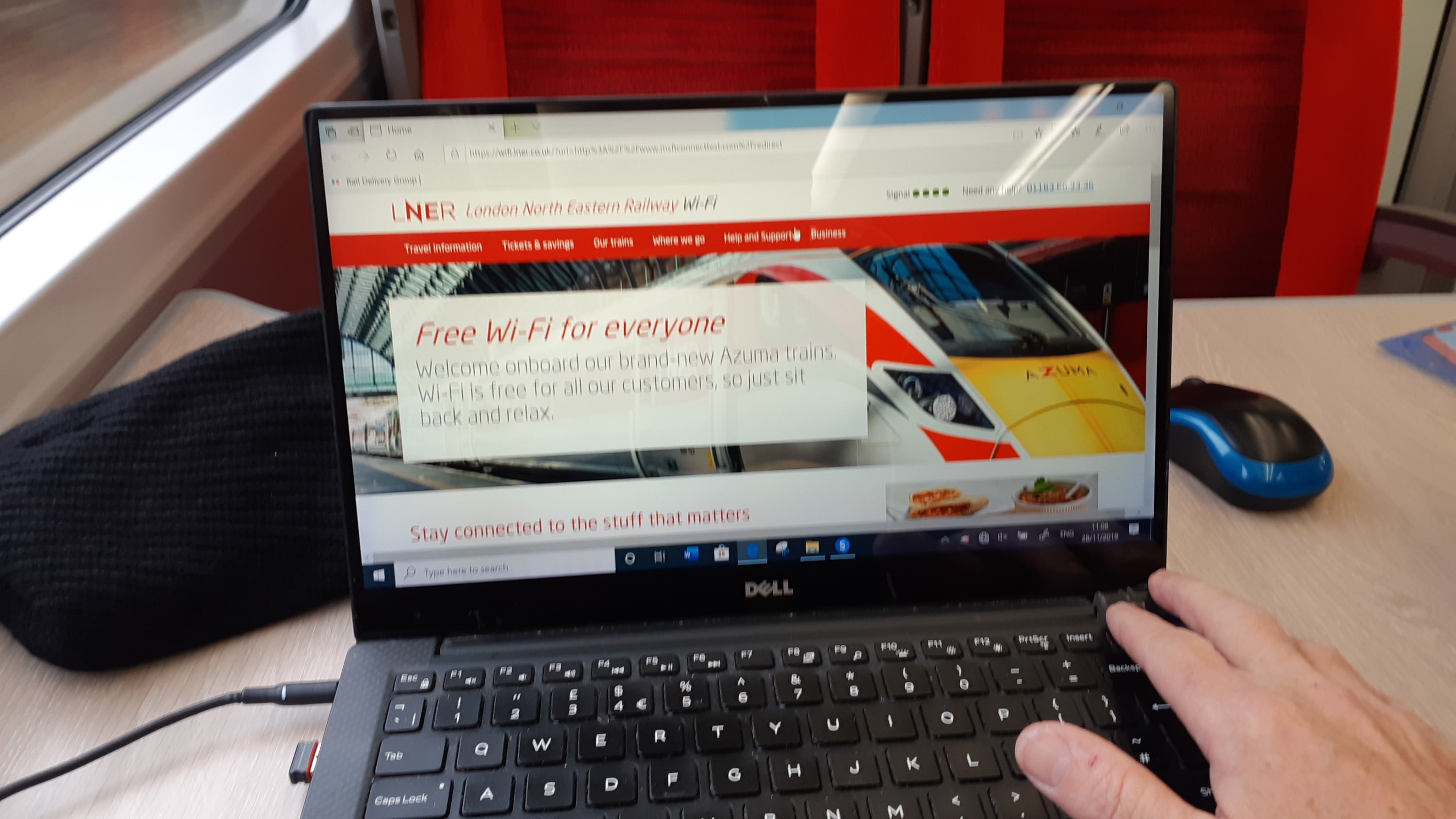 I’m now on an LNER ‘Azuma’, havng abandoned the mark 4 set at Doncaster in favour of 1E09, the Glasgow – Kings Cross that was running 10 mins behind. It’s a busy 9 car but I was lucky and found a free table in coach K right up against the 1st Class portion of the vehicle. The socket works, so I’m up and running!