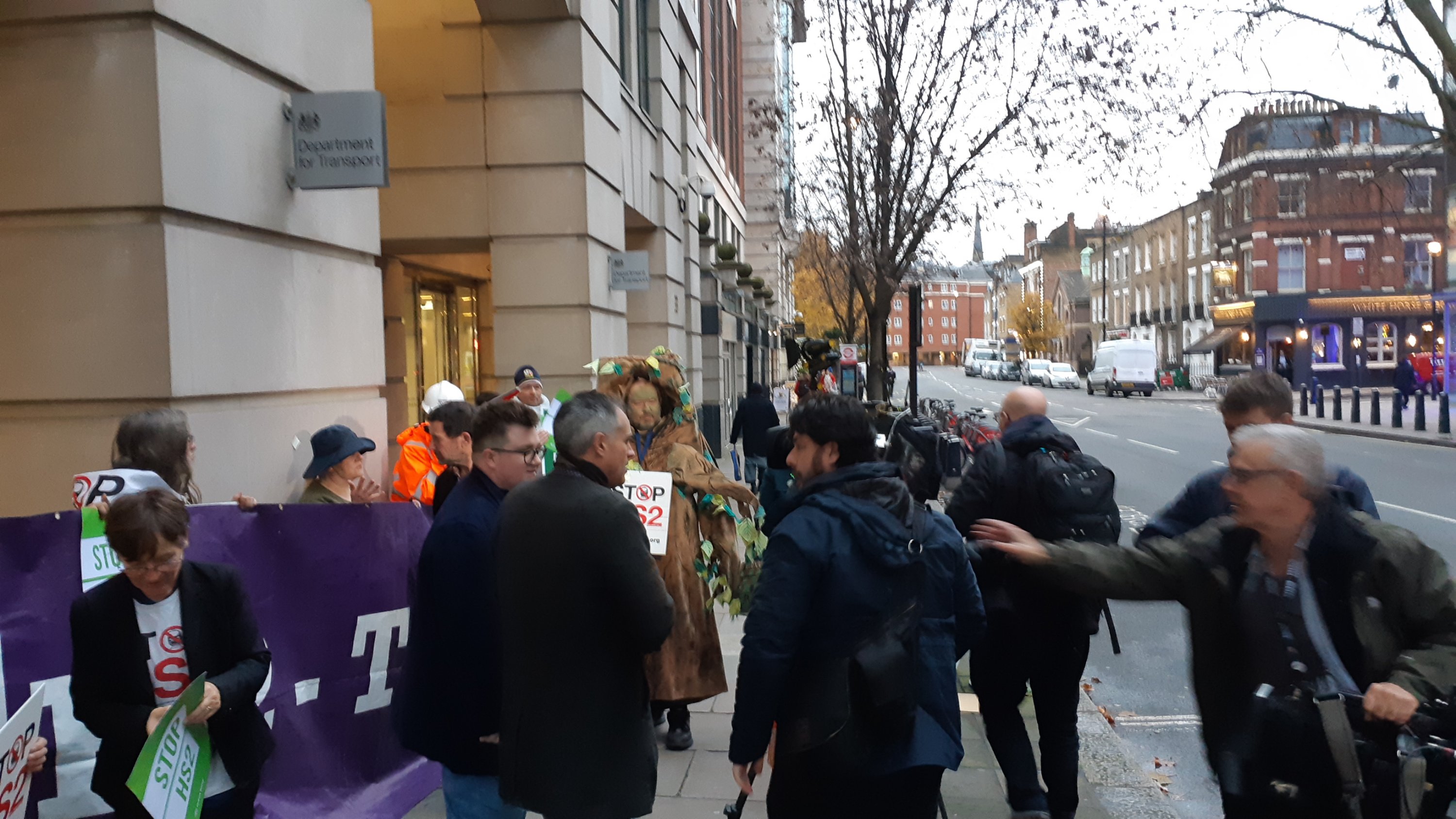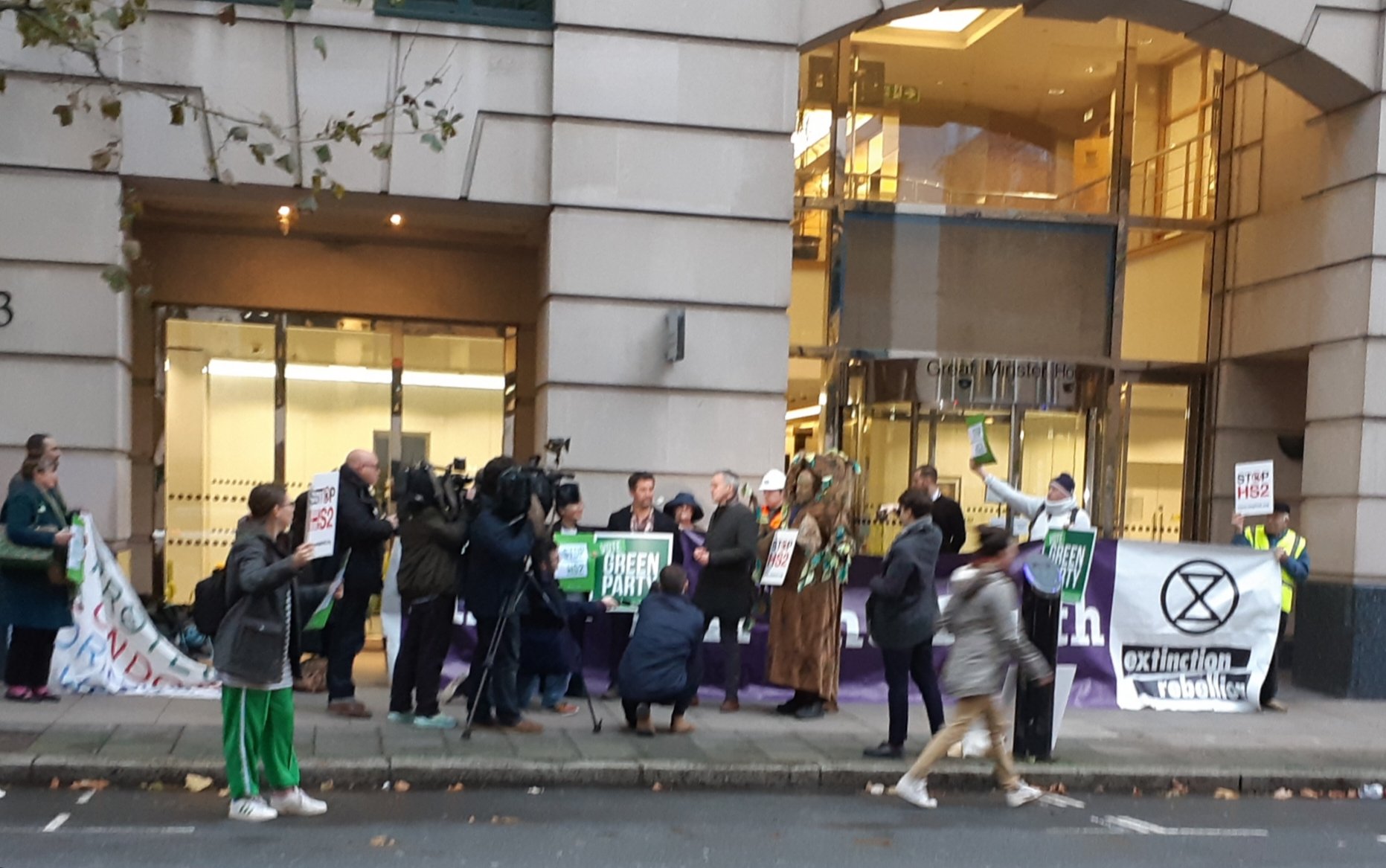 Now I can admit what the second part of the job was! The Green Party and StopHs2 had arranged a ‘big’ protest outside the Department of Transport between 3-4pm today, so I thought I’d pop along and show you what the media (with their close cropped shots of the main speakers) don’t show you! The event was a miserable flop with less than 2 dozen people – including the media – turning up. Needless to say, none of the stophs2 keyboard warriors were there, it was just the same few faces. Green ‘Co-leader’ Bartley turned up, as did Harvil Rd protester Sarah Green. The Green’s candidate in Uxbridge, Mark Keir, was also there. He gave a barely coherent interview to the couple of cameras who’d bothered to attend. Remember, this is the man who stood in Uxbridge in 2017 and reduced the Green party’s share of the vote! The only thing of interest (but not to his advantage) that he did say was by constantly appealing for people to turn up to their ‘direct action’ protests such as Harvil Road. What’s painfully obvious when you see the tedious phone videos they post to their Facebook page is just how few of them there are. They’re completely outnumbered by HS2 staff, security and (when needed) the police.