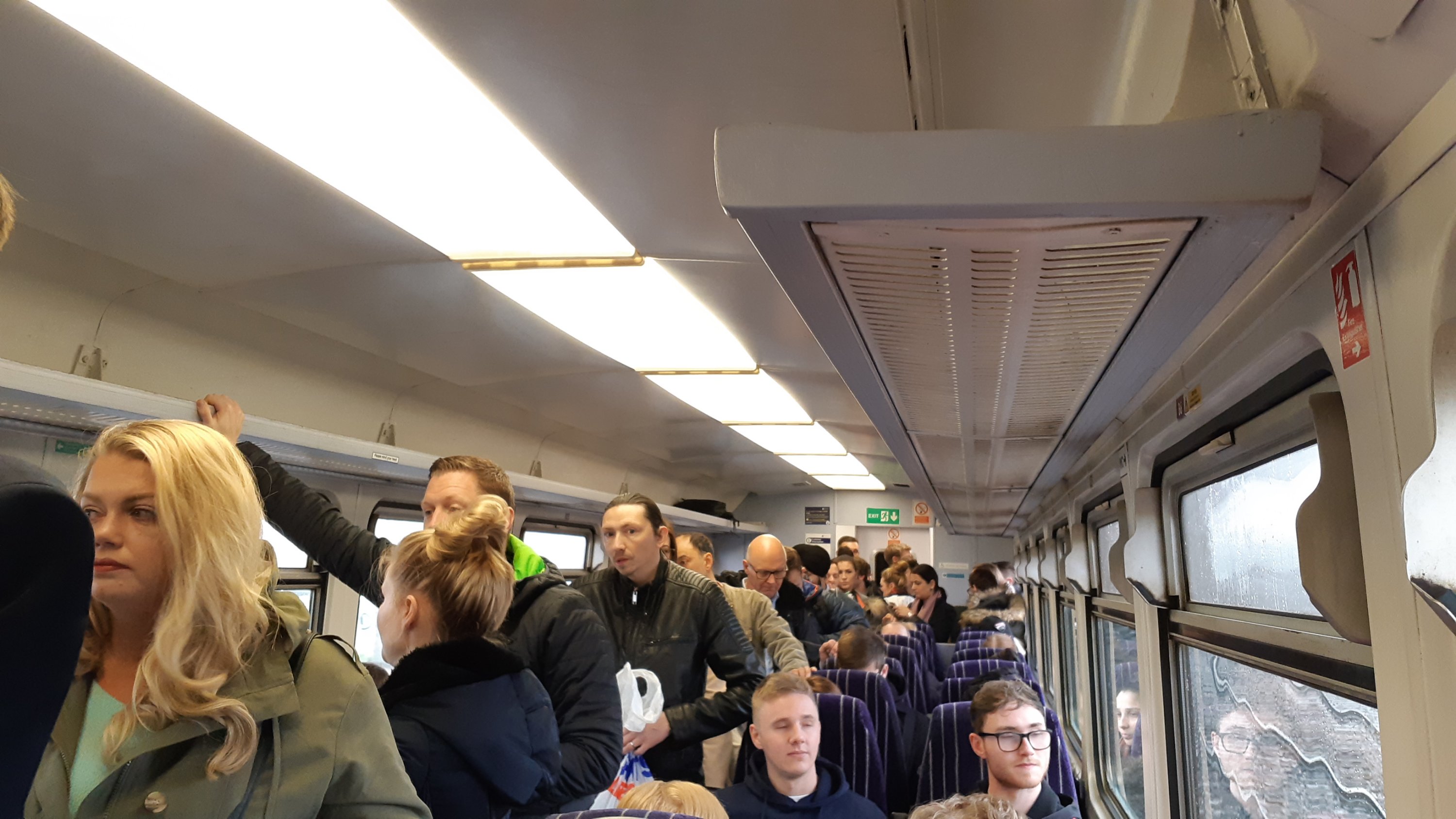 The situation didn’t ease at Bradford Interchange as hardly anyone got off. Fortunately, hardly anyone got on either.08:00.We’ve now called at New Pudsey which was packed with people expecting the Grand Central relief service from Hebden Bridge to Leeds. There were several looks of consternation when our little ‘dogbox’ rolled in. It’s now very cosy aboard!