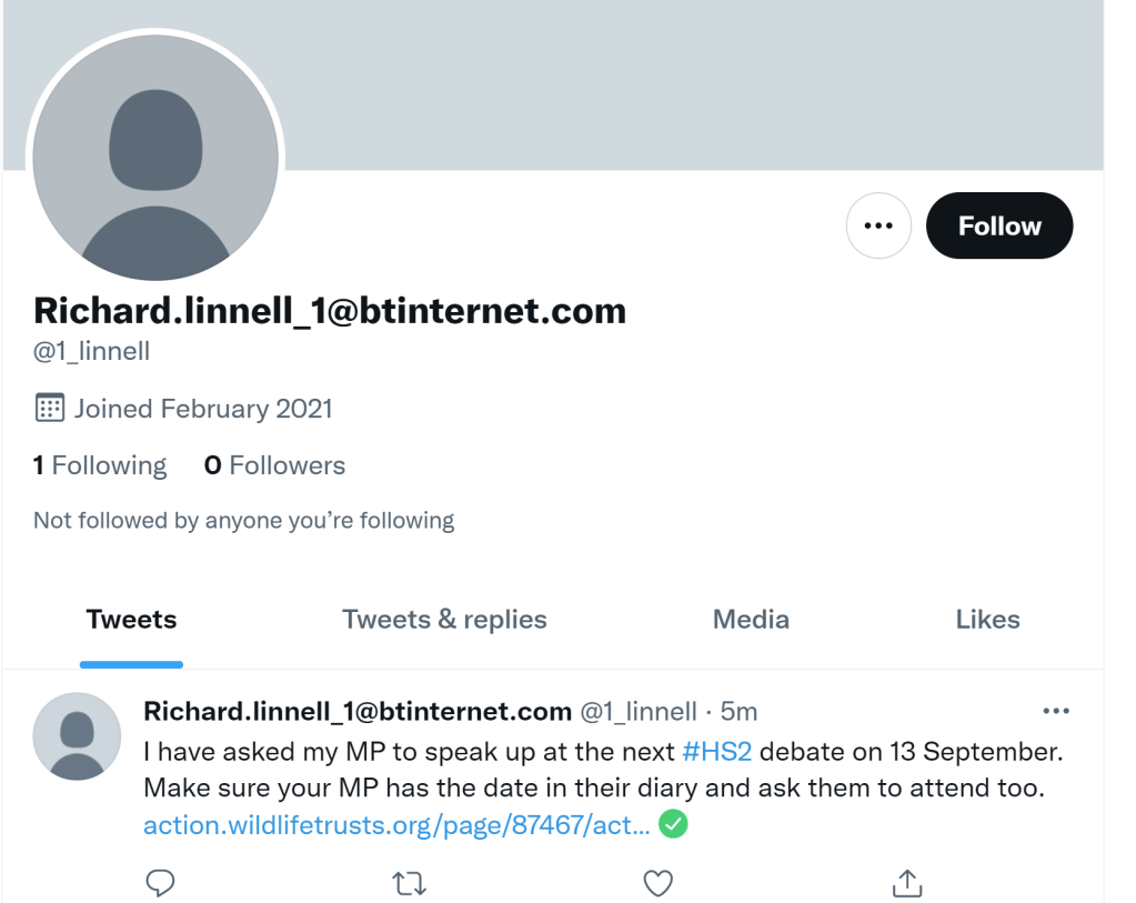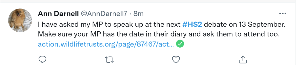 Today Twitter is being bored to death by being bombarded with carbon copy tweets about the waste of time debate on HS2 in Parliament on the 13th September. Here’s a sample. In essence, the Wildlife Trusts are spamming Twitter.