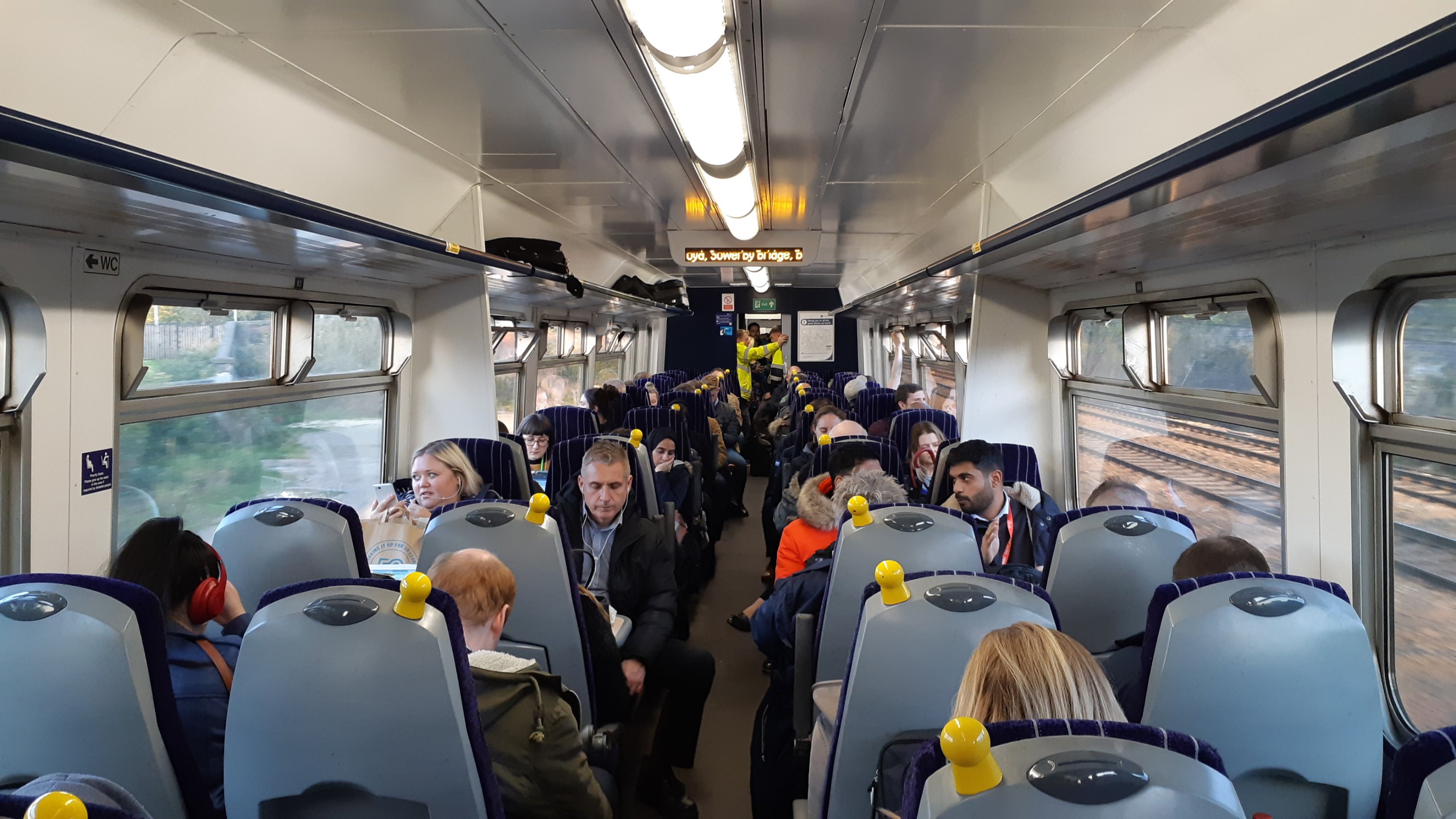 What a difference a few hours can nake to the weather! As I headed home through Manchester the sun was beating through cloudless skies and turning rail tracks into golden ribbons. I couldn’t resist stopping off at Victoria for an hour to capture some scenes and the opportunity presented by a flag-waving lookout stationed at just the right place on a platform end. I’ll ad some pictures later. Right now i’m on a busy Class 156 heading to Leeds via Brighouse as the 17:37 off Victoria.