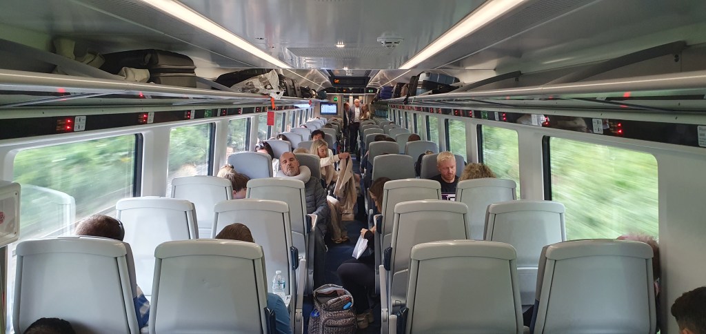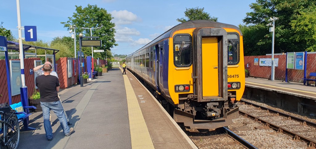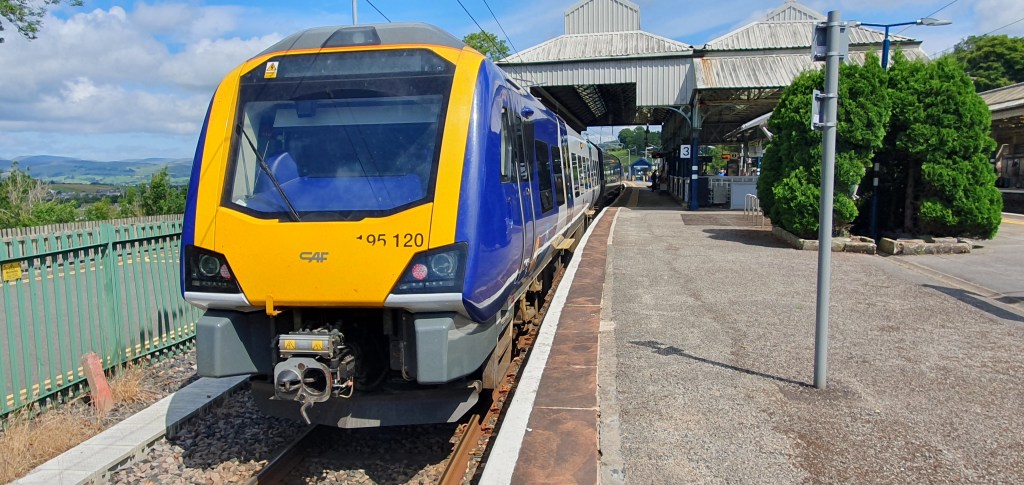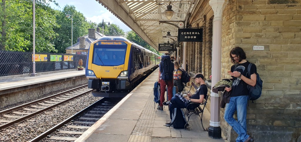 So, this morning I decided that as the weather’s picking up and I’m fed up of being cooped up in the office I’d venture out on the hunt for some of these trains. Right now I’m on a late-running York – Blackpool North service from Halifax bound for Preston. For once I’m glad the trains a few minutes late, otherwise I’d have missed catching it! The doors had already closed as I dashed onto the platform but the friendly young conductor me-mo’d to be to get on through her door. I’m now settled at a table with the mobile office up and running. This is a quiet train, so I can work undisturbed.