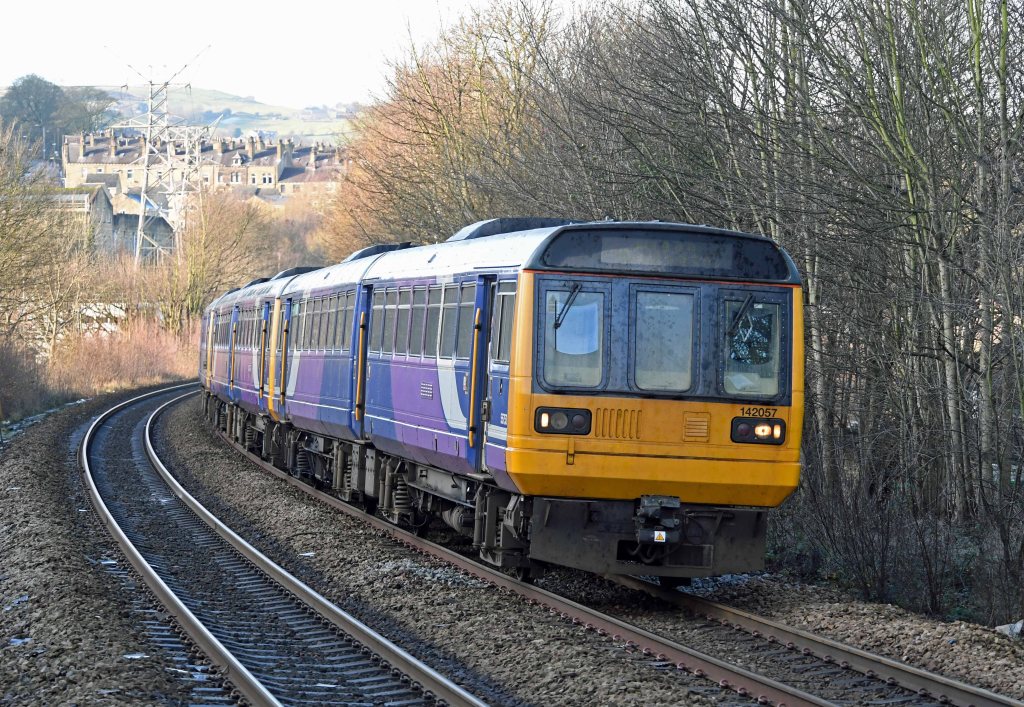 142057 leads 142048 and 142053 through Sowerby Bridge on their last journey through the Calder Valley after 33 years in service.