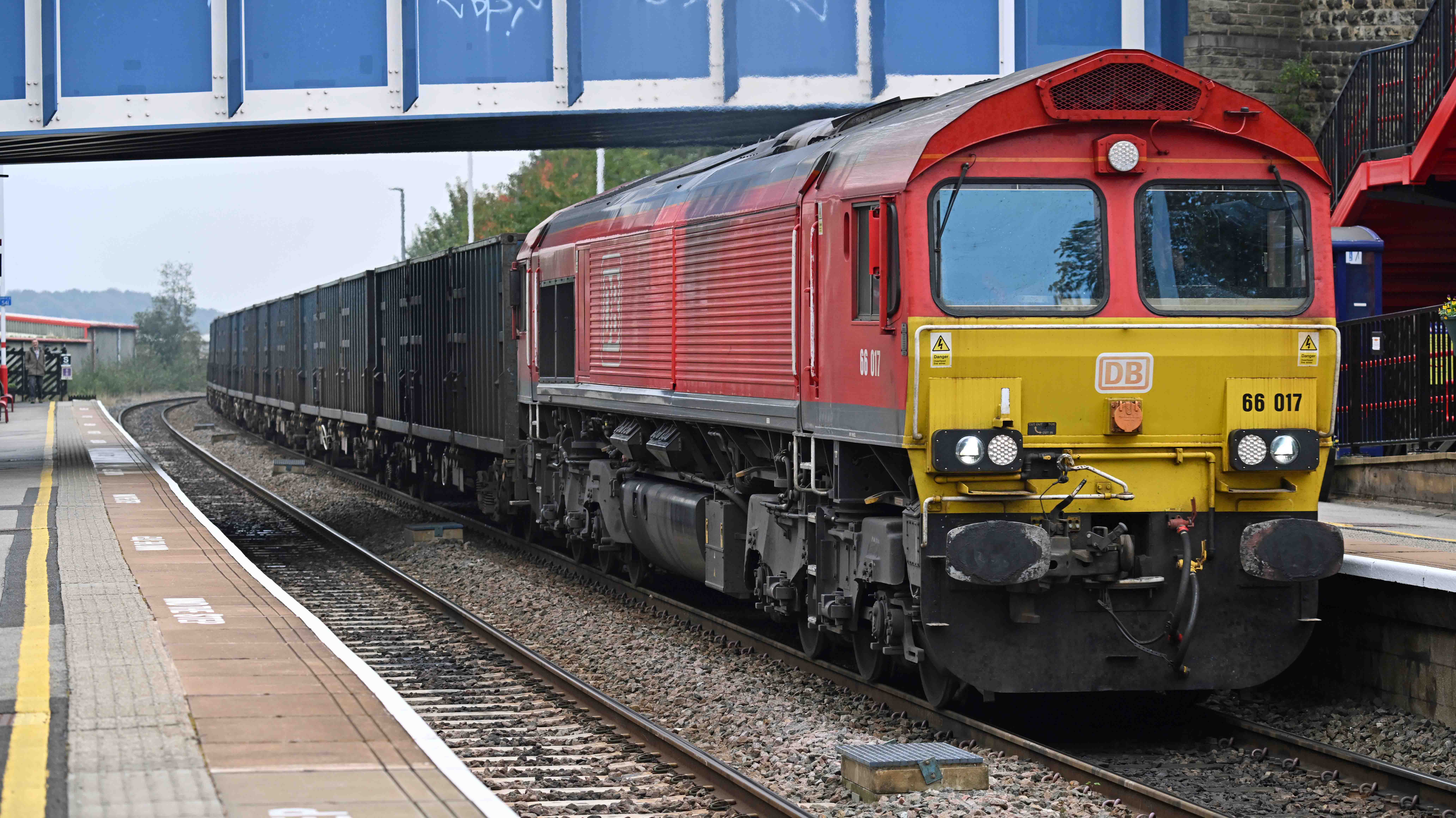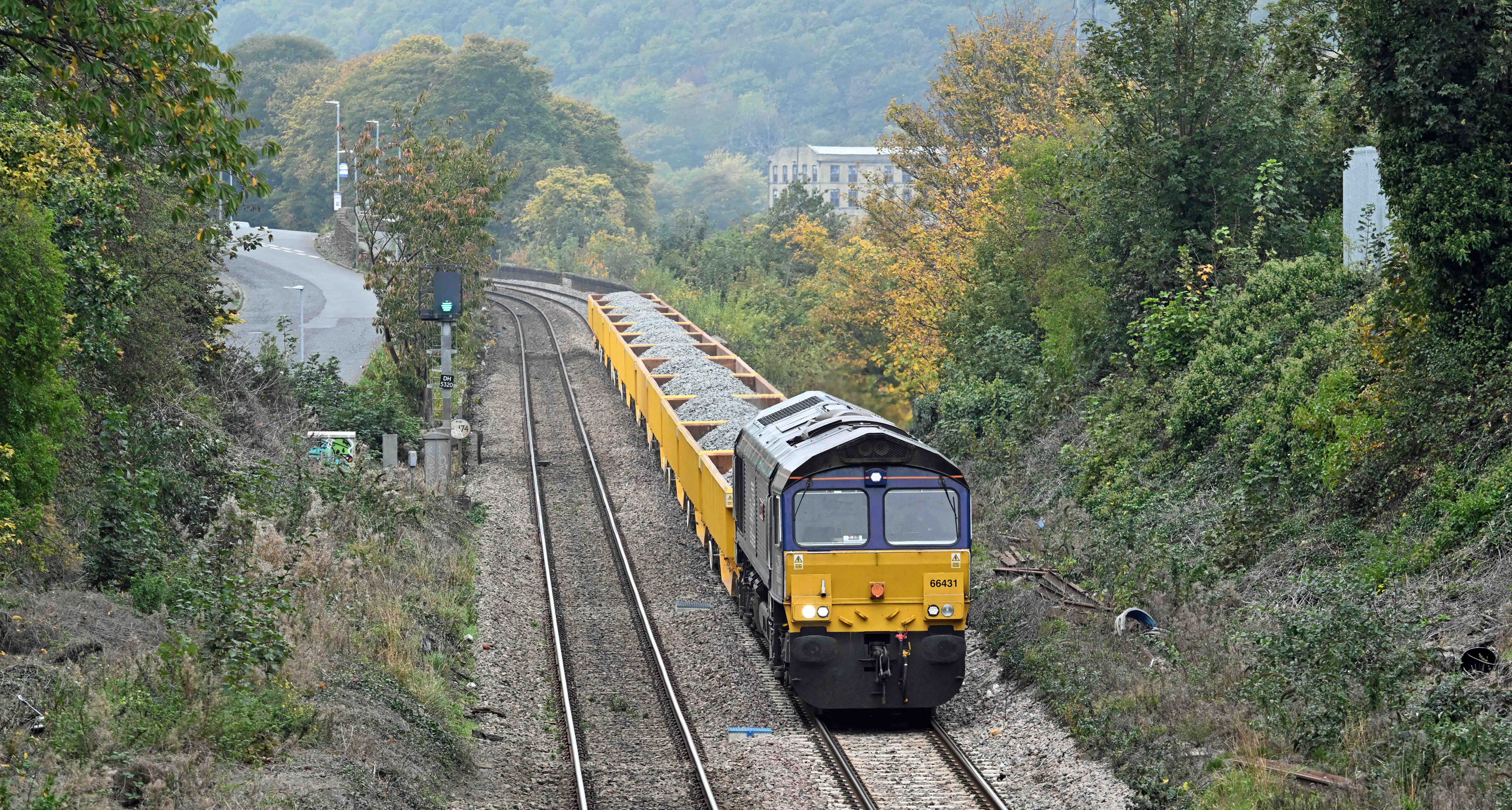 150004 was doing the honours on Friday. After reversing at Bradley Wood Junction it’s returned ready to work 2J66, the 14:30 to Bradford Interchange.66431 approaches the station with a trainload of ballast from the quarry at Shap. The service is 6E73, the 0910 Shap Summit Quarry to Doncaster Up Decoy yard. The train runs Tuesday to Friday. Heading in the opposite direction was DBs 66017, hauling 6M16, the 05:40 Wilton to to Knowsley Freight Terminal empty ‘binliner’