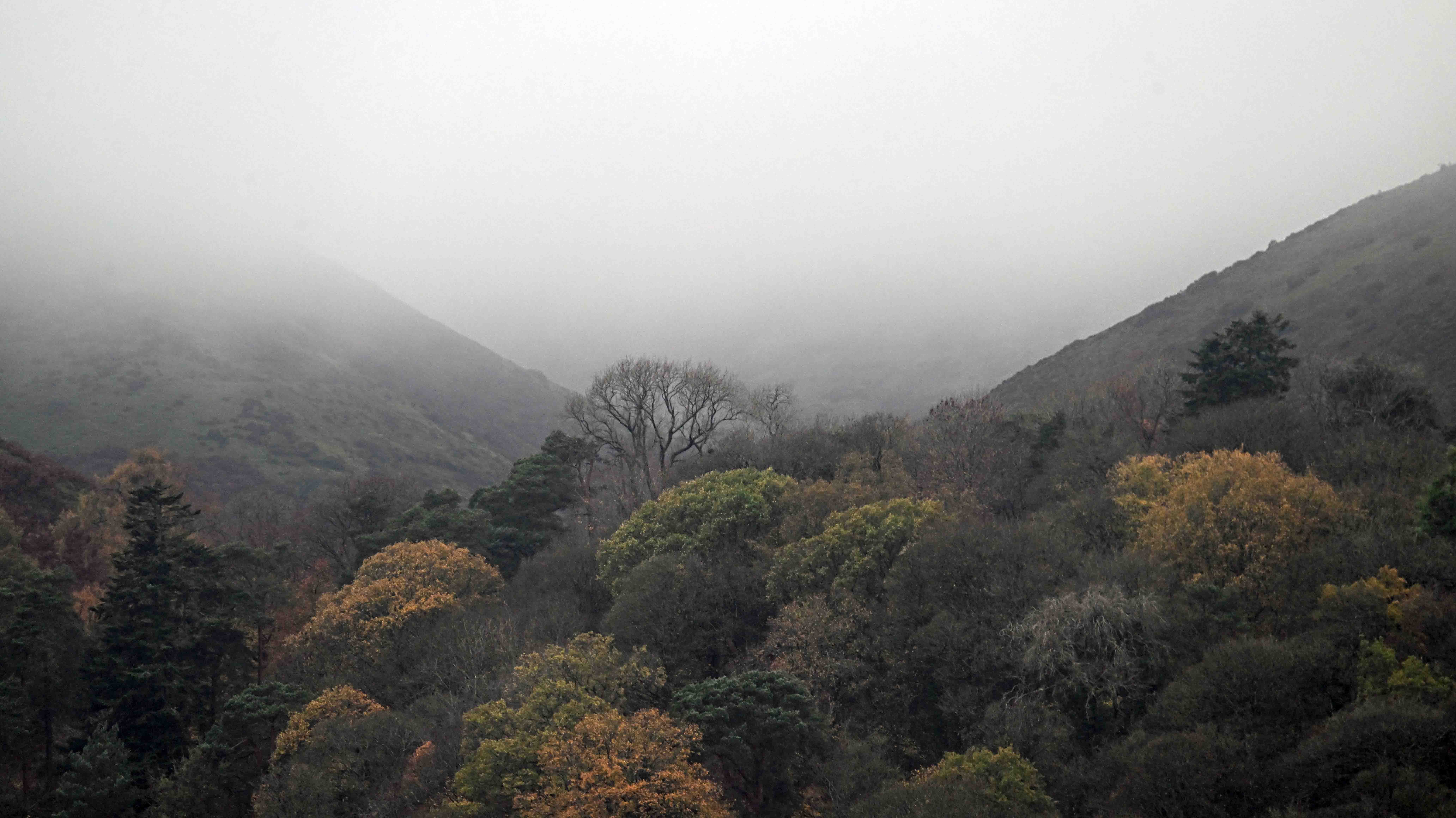 We knew the weather forecast had predicted wet weather today, so we were in no hurry to rush out of the house this morning. Even so, I was up not long after 07:30 in order to throw back the curtains and greet the day. It scowled back, making me wish I hadn’t bothered! This is how the view across to the Long Mynd looked.