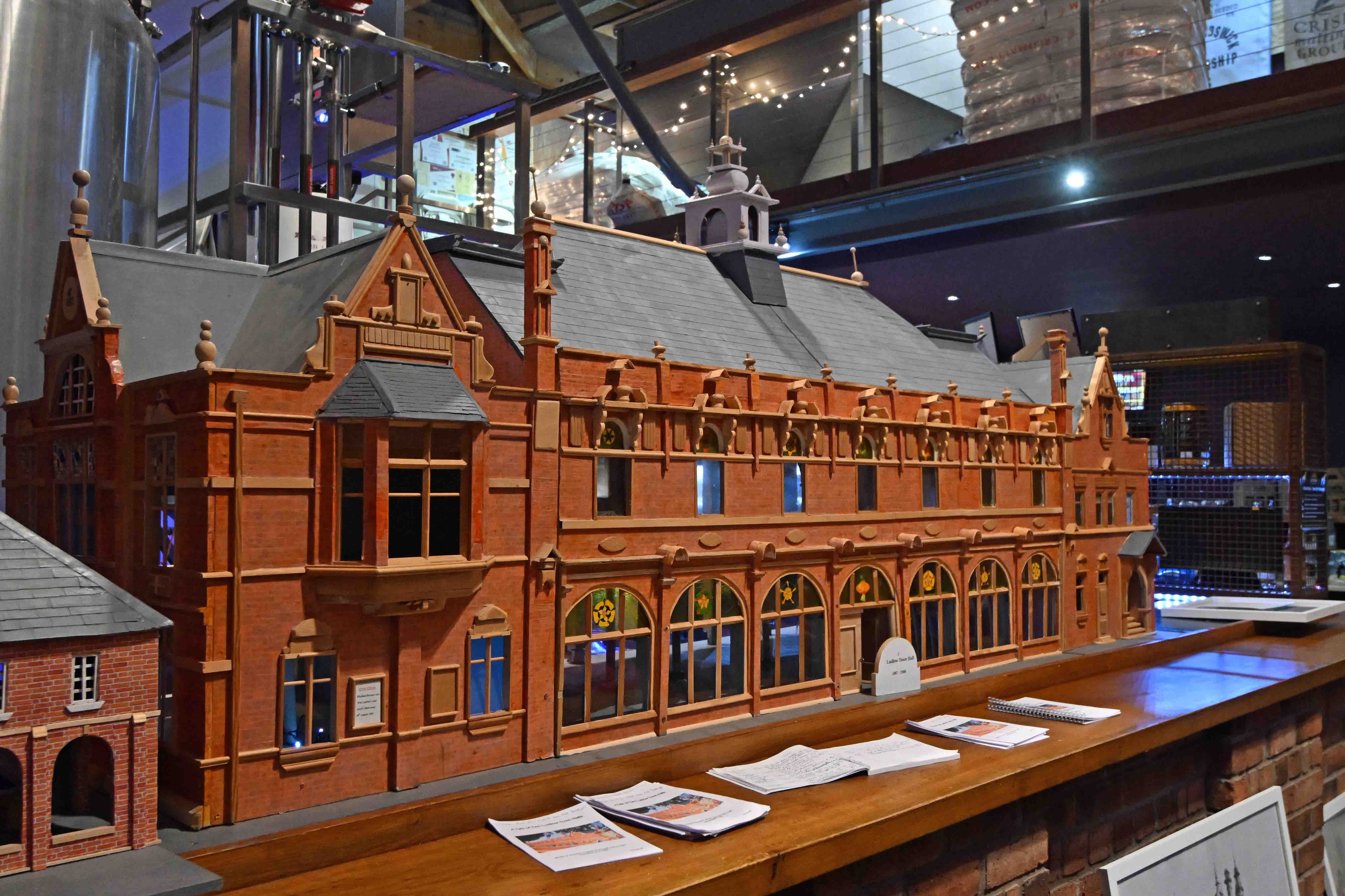 Having eaten, and with the rain renewing its onslaught we dropped off our purchases in the car before heading to the Ludlow Brewing Co, whose brewery is located in an old railway goods shed adjacent to the station. The interior’s very modern and their range of beers excellent. The modernity’s contrasted by two amazing models of the old Ludlow town halls (both now demolished). The Victorian version lasted for just 100 years. It was flattened with indecent (and suspicious) haste in 1986. From descriptions it sounded like an amazing space, which had covered market on the ground floor but a spung dancefloor above. It had survived it would have been a real asset, compared to the sad market that exists today, where a few temporary stalls huddle together, looking rather lost amongst the fine buildings surrounding them.