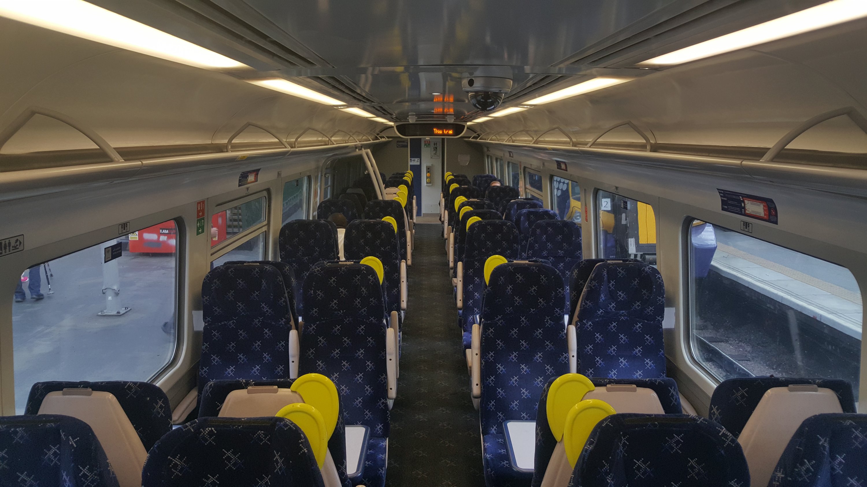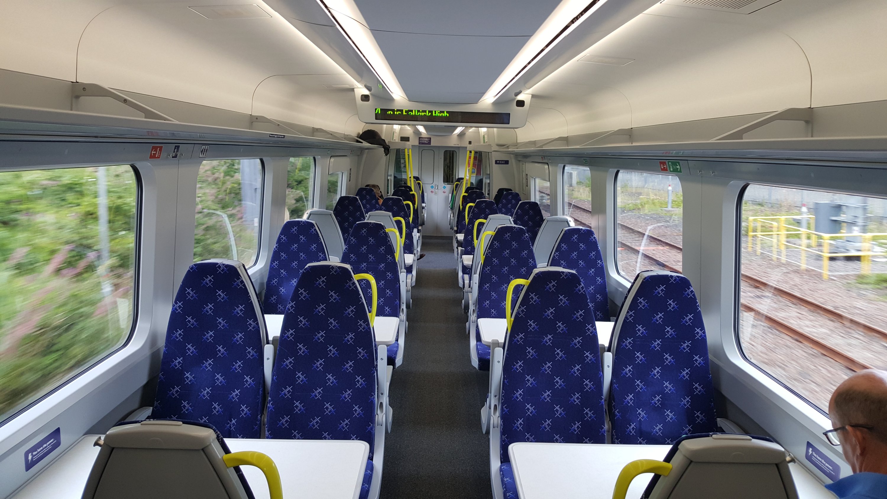 First impressions are good. We’re currently bowling along to Falkirk High and I’ve my laptop set up, plugged into the between seat power socket and connected to the onboard wifi. I’m in the front car of the second set. The acceleration of these trains is certainly good. The internal ambience isn’t bad either. The lighting’s not too bright, the seats are comfortable and the tables are large and certainly sturdy. Legroom in the airline seats is good and the seatback tables are solid, with a useful lip around the edge (with a depression for a cup to stop it sliding). There are a couple of things I’ve noticed. The toilet’s out of order in my vehicle (444104) and there’s a whistling noise from the door seals when we’re at speed. The suspension seems a tad harsh too. The PIS is a bit basic compared to the Siemens Class 700/707 too, it’s a simple, scrolling dot-matrix system that tells you the time and what station you’re arriving at next, plus your final destination. I do like the seat moquette on the priority seats adjacent to the doors. They have a different motif which feature pregnant women and those with children, the elderly and folks with injuries! Signage is good, although the seat numbers (which are displayed on the walls above the seats) are tiny and very difficult to see – even close up. If seat reservations will be used they’ll have to be the good old fashioned paper kind as there’s no electronic system provided.
