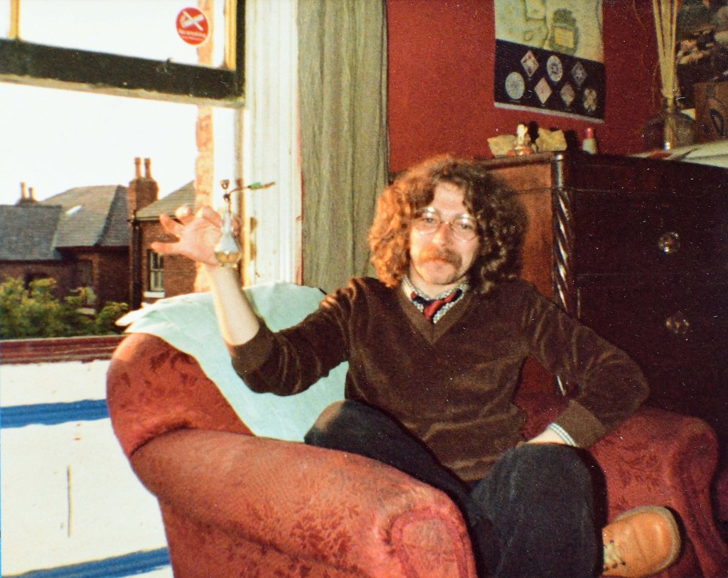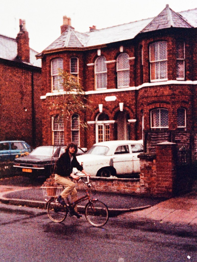 Mike Smith in 1981, holding a bong containing, illicit smoking material.. Mike was always smartly dressed and normally sported a tie or bow-tie. His diminutive frame meant he could often pick up bargains from the kids section in charity shops!Mike in the same year, when he’d just moved to Southport where he’d got a bedsit in a house on Scarisbrick New Rd. He’s riding my mums bike and carrying a bamboo plant we’d dug up out of my parents garden. The house became something of a social centre as my sister Ruth also moved into a flat there. I remember one Christmas the house got together for a jojnt Xmas dinner with people cooking different part of it in their baby Bellings, then coming together in Mikes room. We didn’t have a dining table so we used an old advertising hoarding ‘borrowed’ from somewhere, and a couple of trestles!