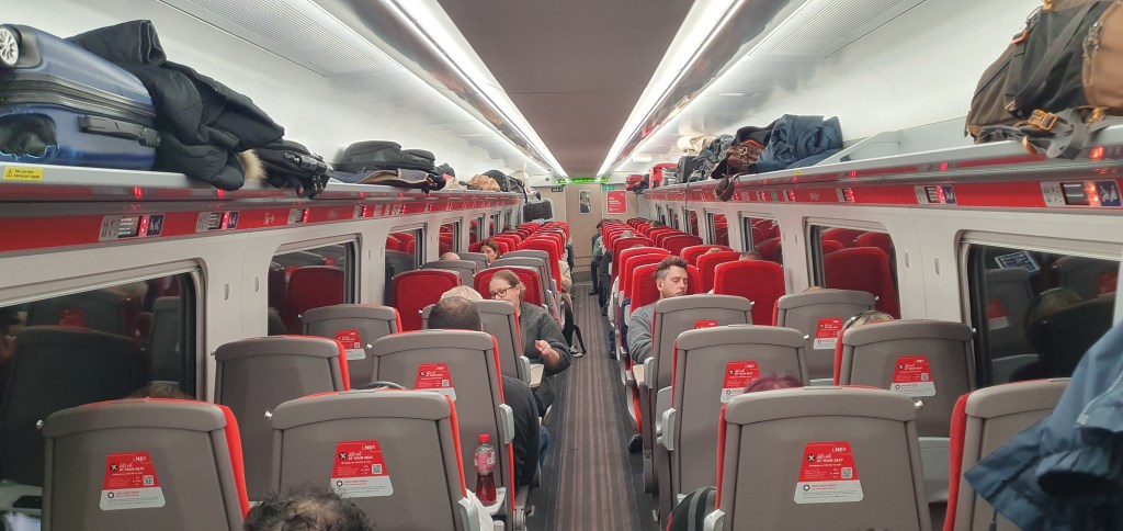 Admittedly, the train’s packed, not helped by the fact it’s only a five-car Azuma to Skipton where the first stop was Peterborough. I’ve been resident of a vestibule since the ‘Cross as the seats vacated by ‘posh’ commuters were soon filled by others joining form points East.