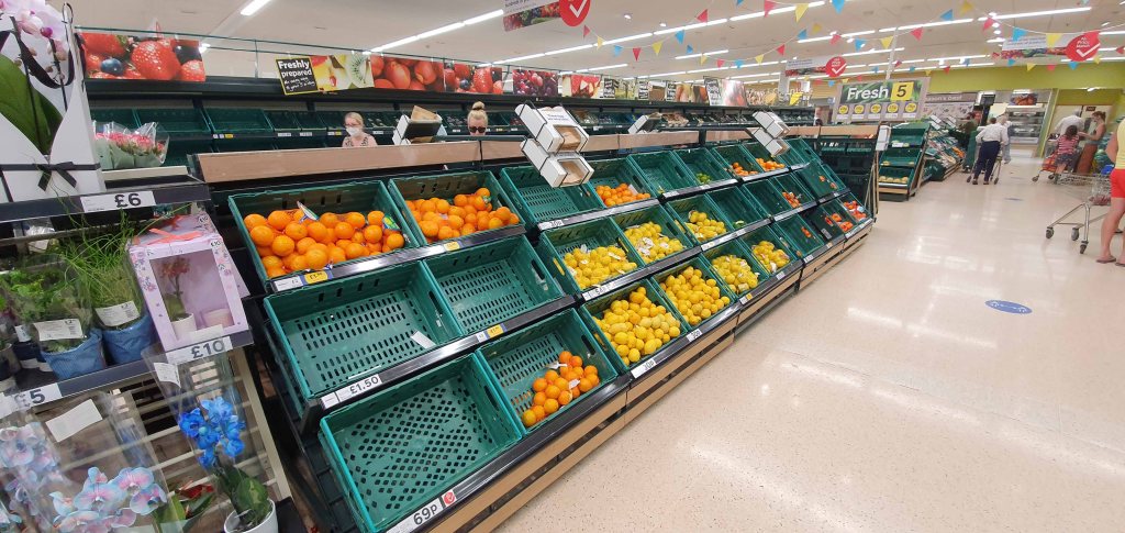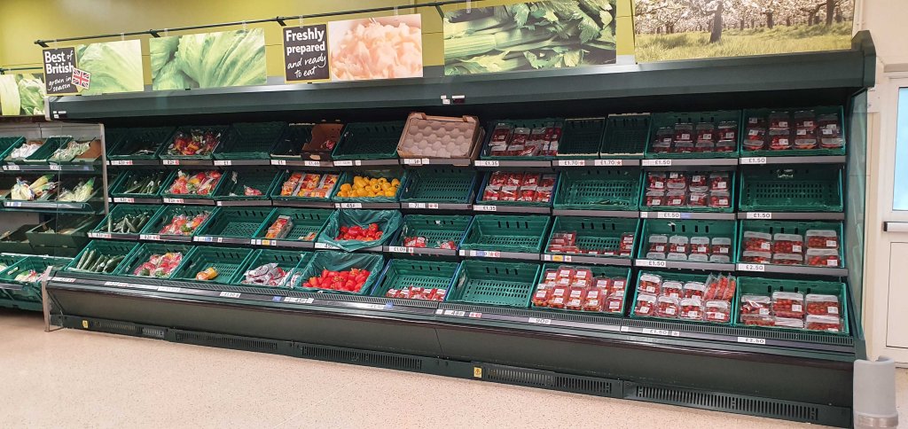 Really? Well, Covid is a global pandemic that’s hit the entire planet, so surely, other countries must be suffering the same problem, no? Here’s a few shots I took at my local Tesco supermarket today. This is a Sunday morning. The shops had all night and until 10:00 to restock and replenish before opening its doors to the public. I took the pictures at 11:50 when the place had been open for less than two hours. One of the things I was shopping for was Strawberries. Here’s where they should be. These shelves have been empty for a couple of days. The surrounding soft fruit shelves aren’t much better.