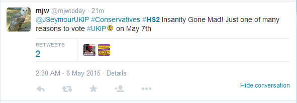 The level of frothing on Twitter is beginning to rival a Fairy Liquid factory – so I have to give a mention in dispatches to this UKIP Tweeter for his supremely bonkers comment that Hs2 is ‘insanity gone mad’…