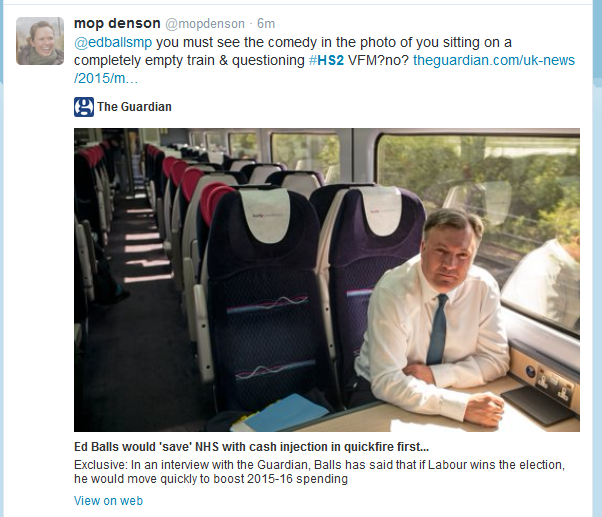 Without the slightest trace of irony, Mop claims there’s ‘comedy’ in the photo of Ed Balls in an empty First Great Western 1st Class coach en-route to Cardiff. We’re not told where he’s coming from, what day – or even what time of day. But hey, why should facts matter to Mop?