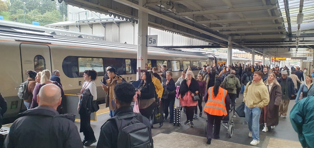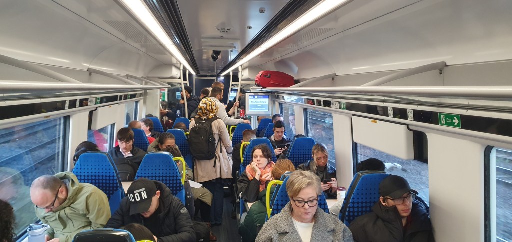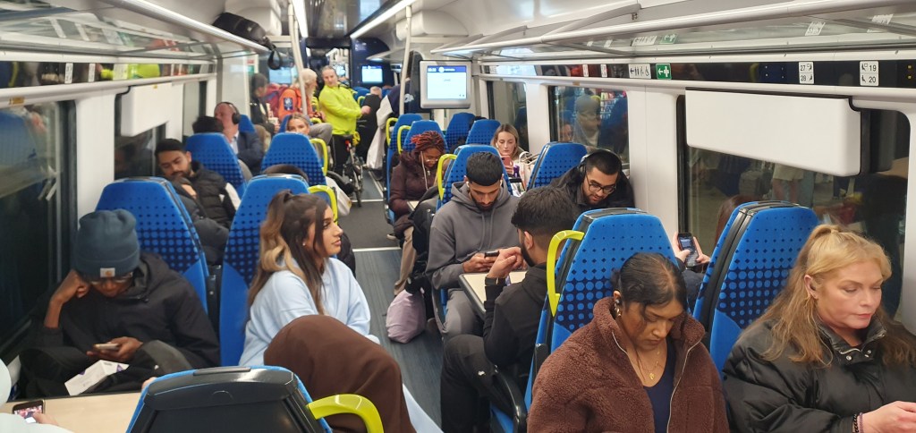 We’re off. This 5 car Meridan is 25 mins late coming up from London, which hasn’t helped. Add in the usual confusion as folks try and find their reserved seats or ones that are free and the delays mount.
