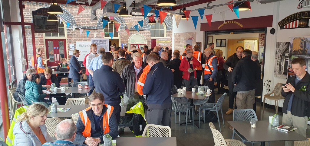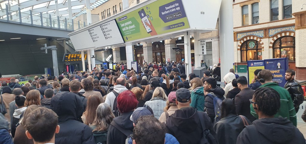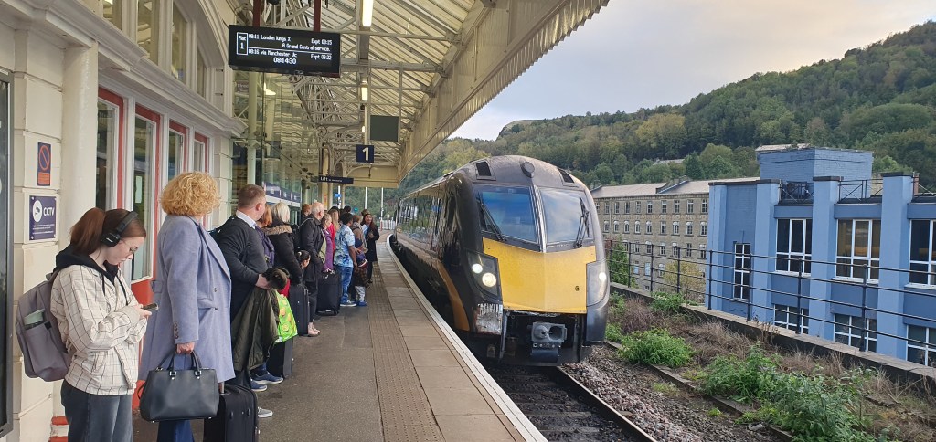 Not a vintage day on the railway. My 2 car train burbled its way as far as Meadowhall where it got stuck for some unknowable reason, arriving at Sheffield 5 mins late, giving me just 5 mins to make my connection with an East Midlands Railway service to London via Chesterfield. Only – that’s late too! Thank God I have a few minutes in the bank. And now for the scrum…