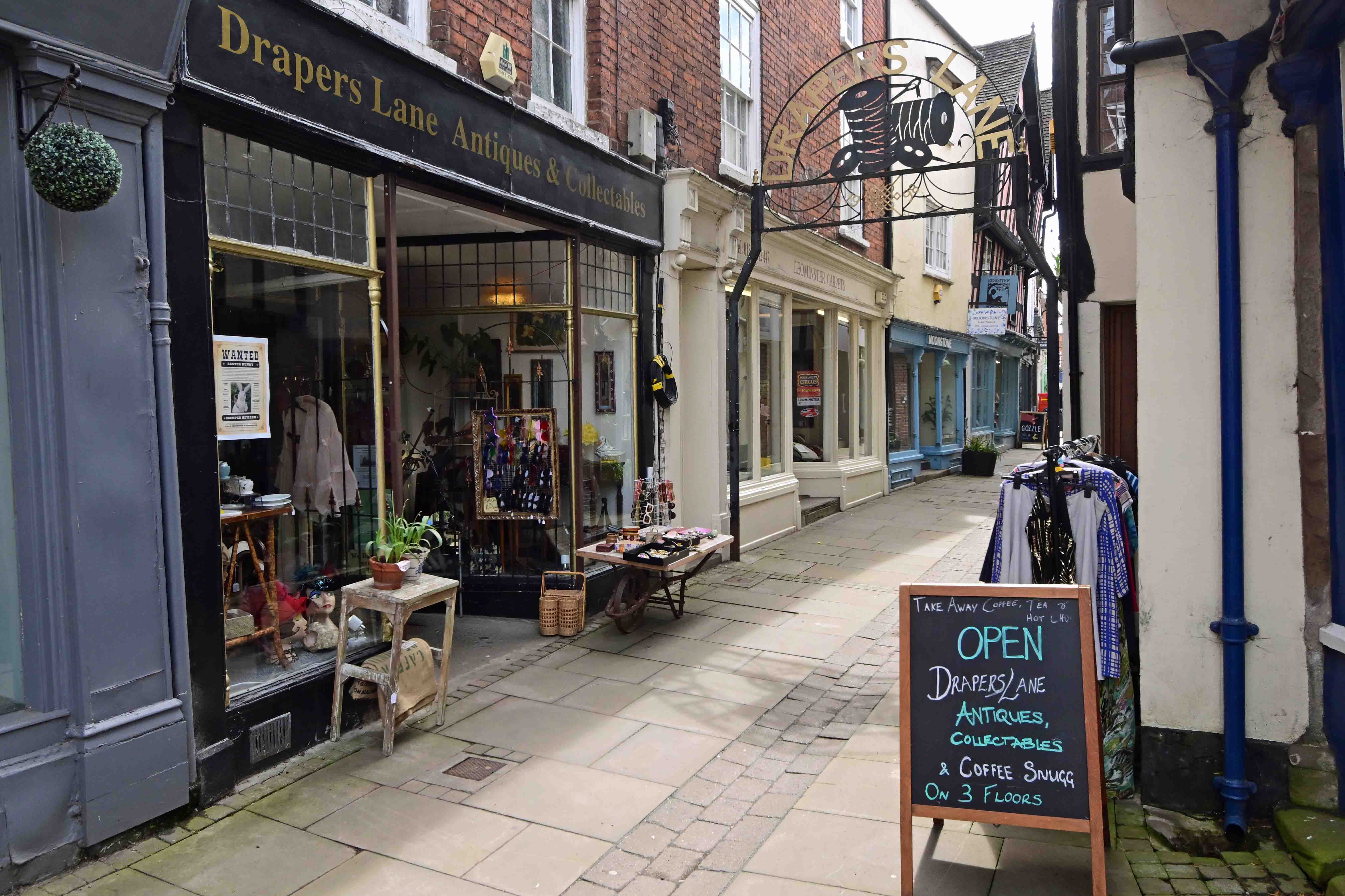 Our experience of Leominster was mixed. Architecturally it’s fascinating with building design spanning hundreds of years. The layout of much of the town centre is still mediaeval, although many buildings have been replaced (not always sympathetically). But, compared Ludlow to it’s very shabby. Many of the buildings are in a poor state of repair. Plus, there’s a lot of vacant properties. But what the town centre does have in abundance is seamstresses and antique shops. Hence Drapers Lane.