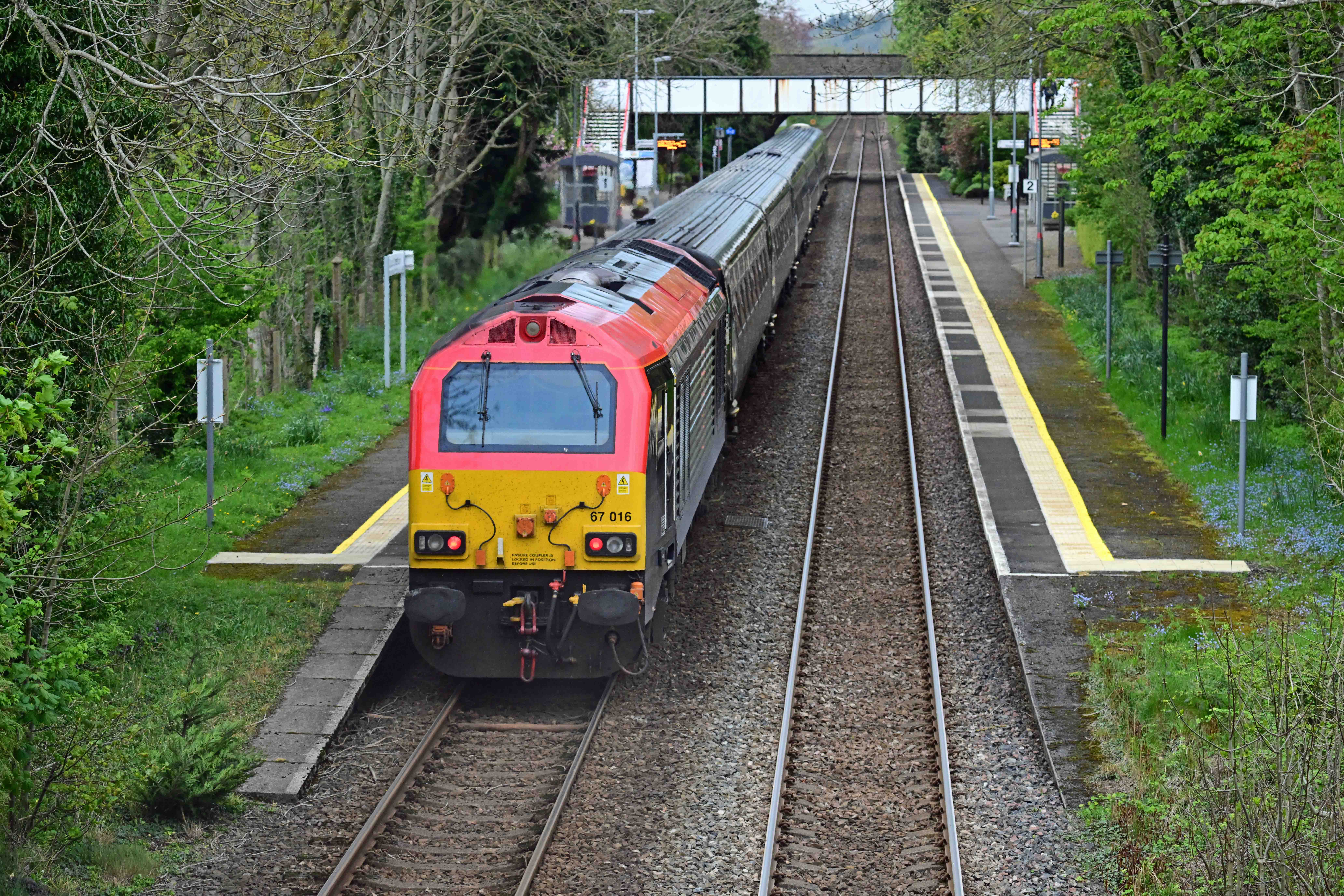 A Transport for Wales Class 150 calls at Church Stretton whilst working 2V30, the 1835 Shrewsbury to Swansea service via the Heart of Wales line.One of Transport for Wales hired-in Class 67s thunders through the station non-stop on 1W96, the 1722 Cardiff Central to Holyhead.