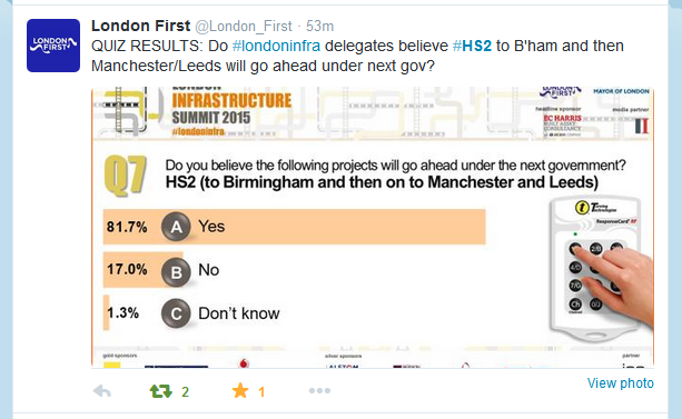 Meanwhile, at the same time The London Infrastructure Summit was going ahead. Delegates were asked if they thought Hs2 would go ahead under the next Government. Their answer?