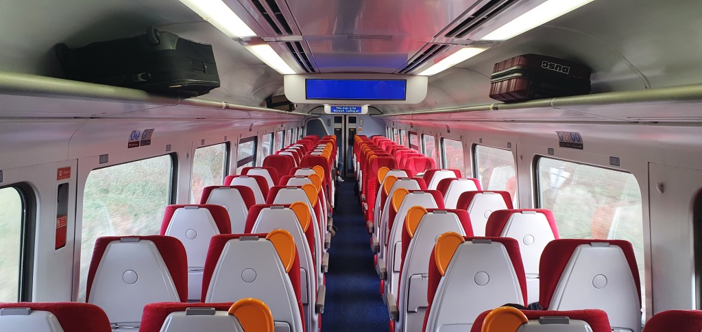 Another train, another operator. Now I’ve swapped my fancy intercity ‘Azuma’ for an example of BRs finest “garden shed engineering” as the Class 158s were once described due to the many faults that bedevilled the first examples. Mine is one of East Midlands Railway’s fleet of 2-cars with high-backed seats but no USB or power-points, which is a retrograde step in this day and age.