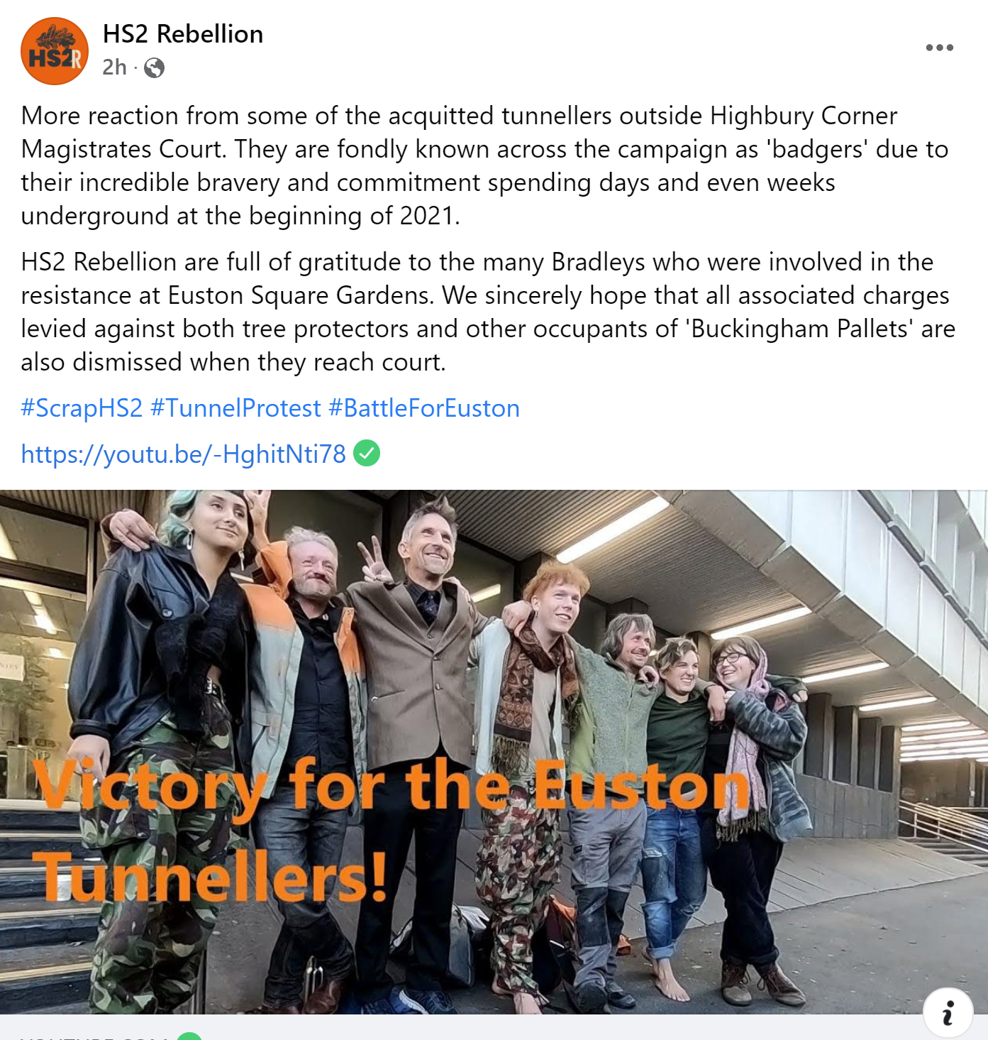 Yesterday, at Highbury Magistrates court District judge Susan Williams dismissed the charges against the seven, leaving HS2 ‘Rebellion’ in boastful mood – as this post on their Facebook page demonstrates.
