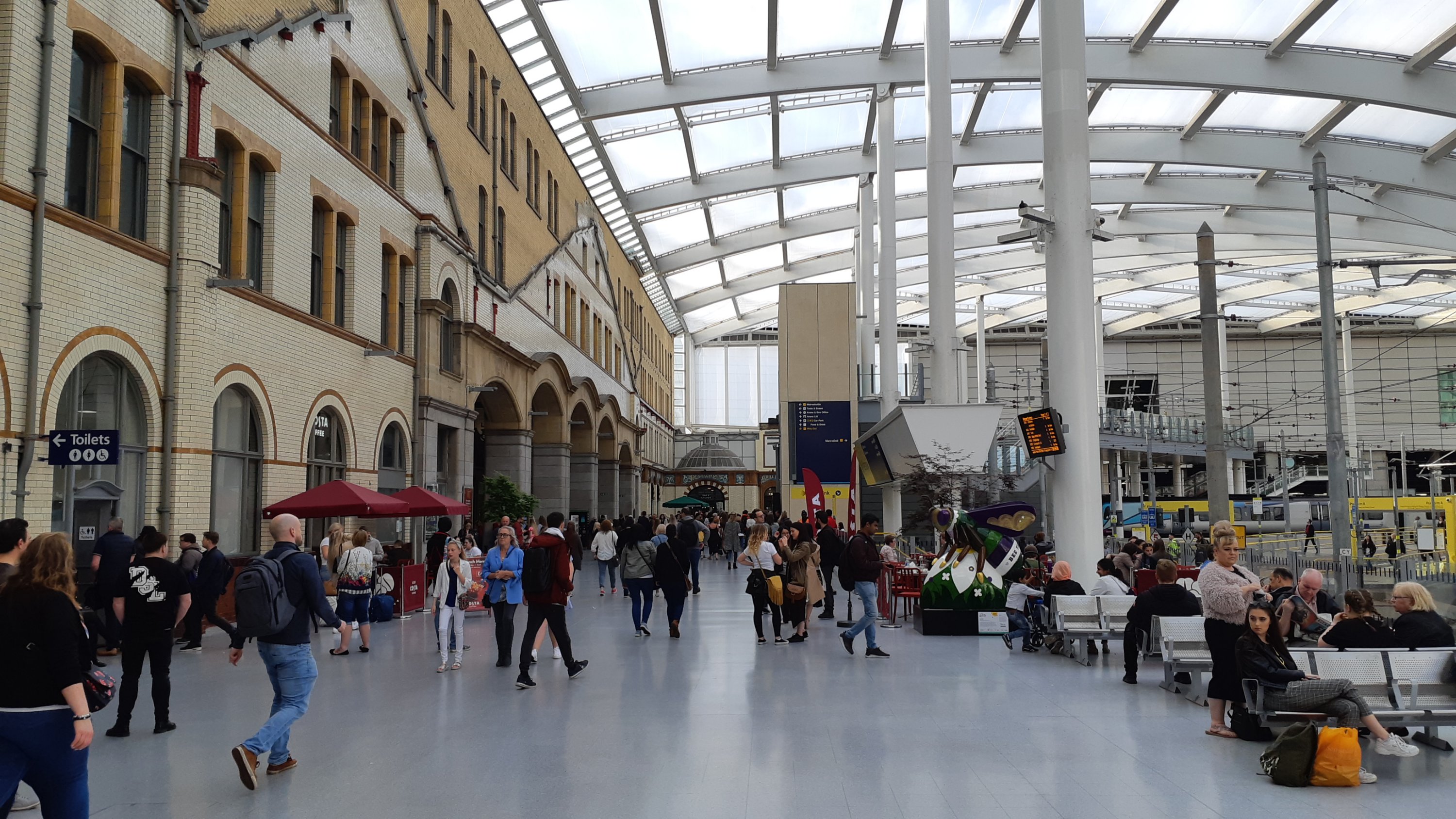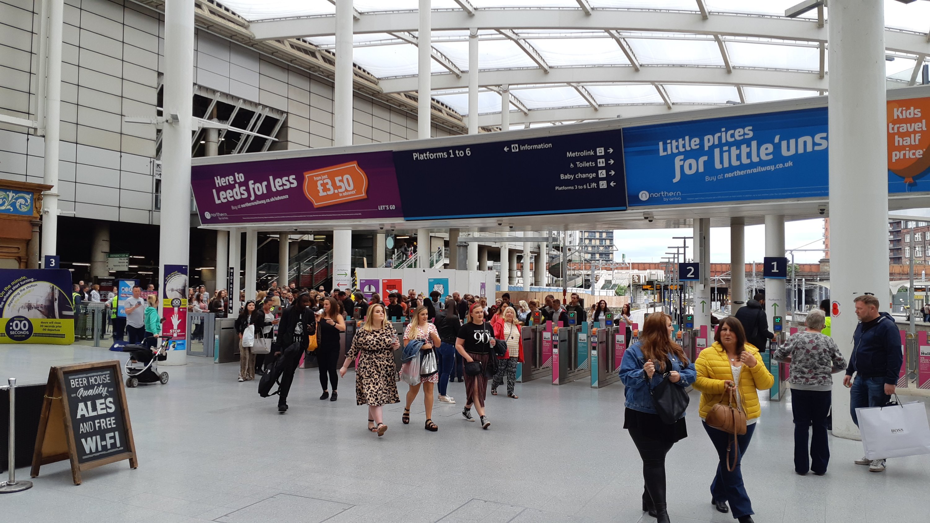 Having left Wigan and constantly criss-crossed out of weather fronts I pitched up in Manchester to change trains once more. Now I’m heading back across the Pennines aboard a busy commuter service, the 17:19 to Leeds which is worked by Class 156/153 combo. The atmosphere aboard is quite subdued. There’s little sign of people looking forward to the weekend, more a like a lot of knackered folk thinking “thank God it’s Friday!”