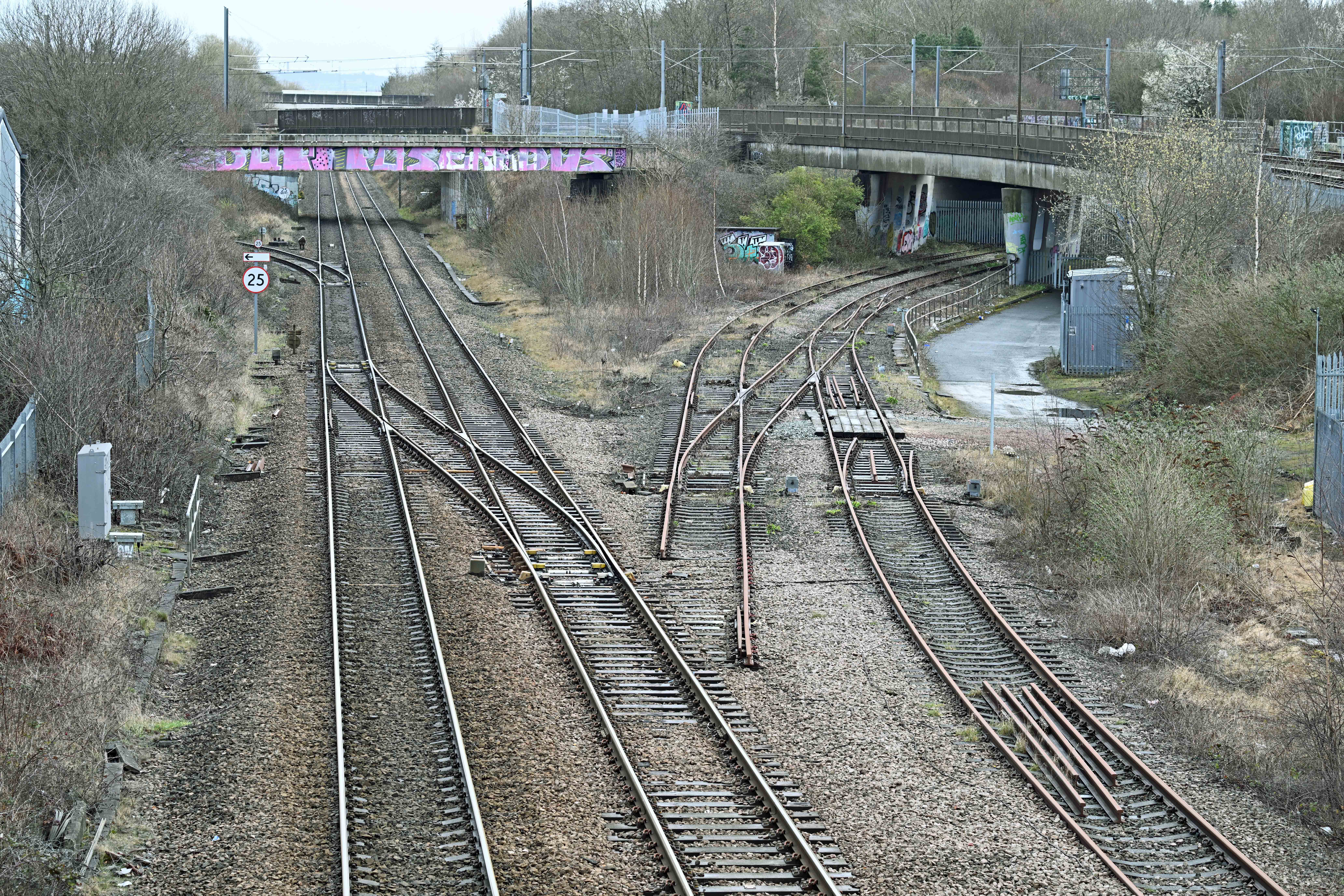 The truncated remains of the Leamside line at Pelaw junction disappear under the T&W metro flyover to the right. The national rail route to Sunderland, Hartlepool and Middlesbrough are in the centre whilst the single track to the left is the spur to Jarrow oil terminal.