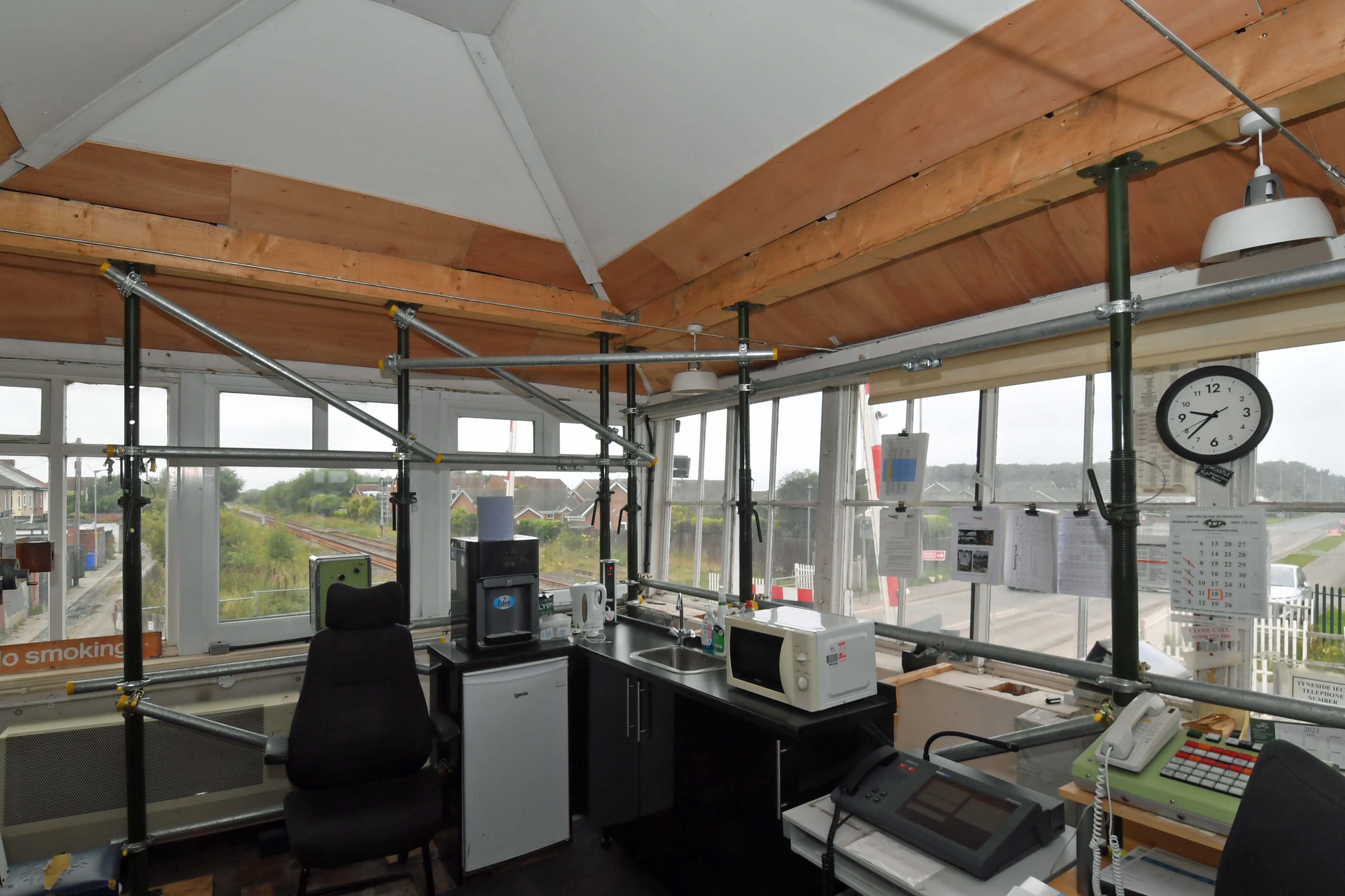 The level crossing and signalbox at Newsham South will both be redundent. In the background’s one of the cranes working building the new road flyover. The signalbox is in poor condition.You may notice the way the wooden structure’s leaning towards the track. What you can’t see is that the inside of the box is shored up with scaffolding!