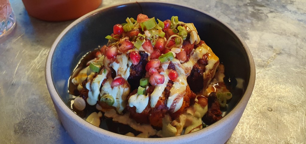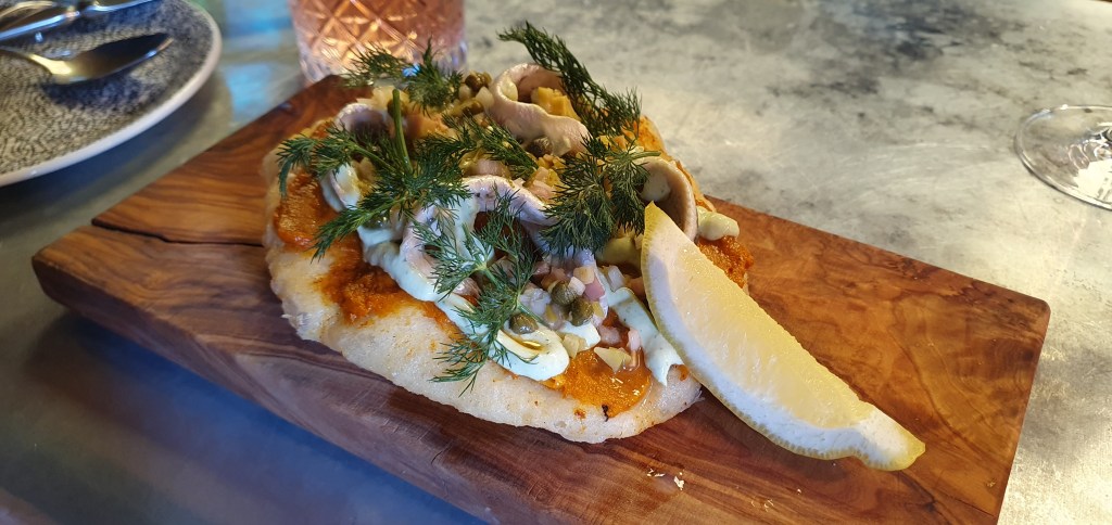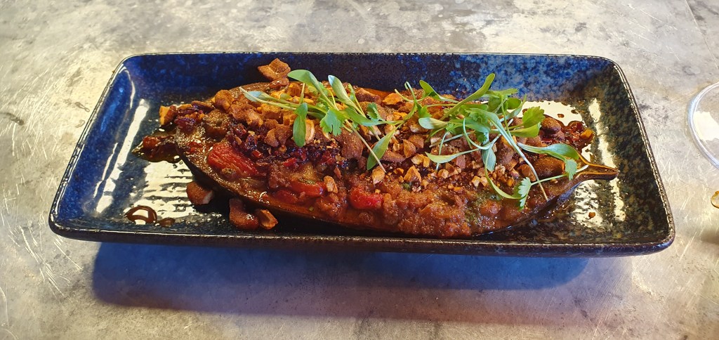 BOQUERONES: Spanish pickled white anchovies on sun blushed tomato flatbread.FIRE ROASTED CAULIFLOWER with Pomegranate, chilli and sesame dressing.SLOW ROASTED AUBERGINE with pork, crispy chilli and crushed spiced cashew nuts.