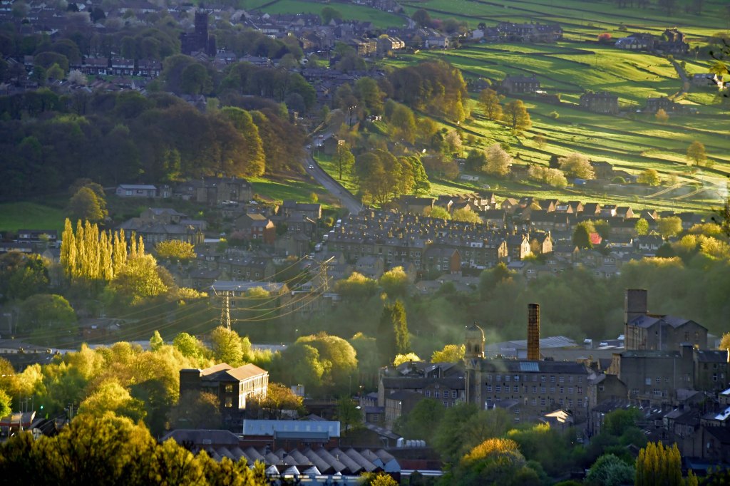 Sowerby Bridge seen earlier this evening in low spring light with the road up to Sowerby prominent in the picture.