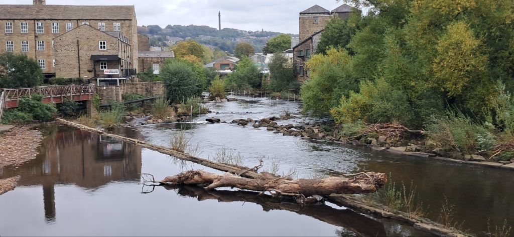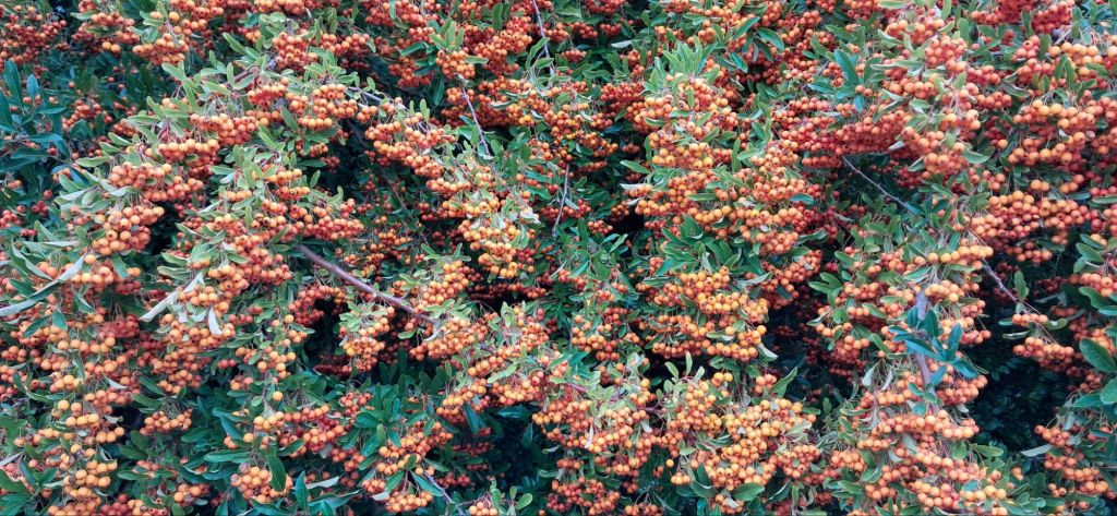 The Rochdale canal looking towards Tuel Lane lock. It’s haighly unusual to see it like this so late in the years, although this section being closed to navigation is becoming more frequent due to lack of rainfall. In contrast to the canal the River Calder has obviously been high in recent weeks – hence this old tree stuck on the weir, which is a recent addition. I wonder how long it’ll remain stuck there? One thing we’ve seen in abundance this year has been fruits and berries. We’ve had a cracking blackberry season and acorns aplenty. This bush in the centre of town is showing the same spirit.