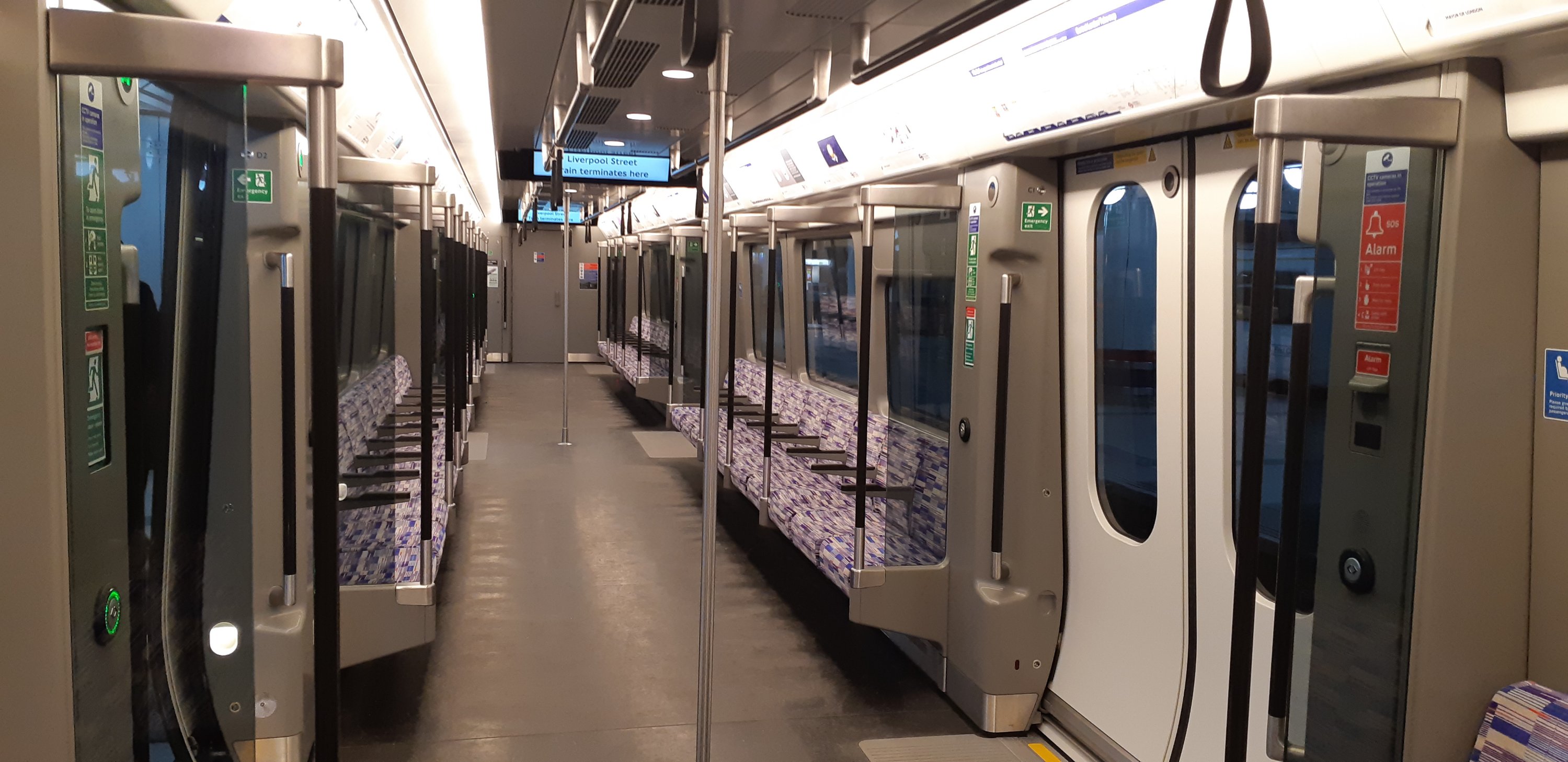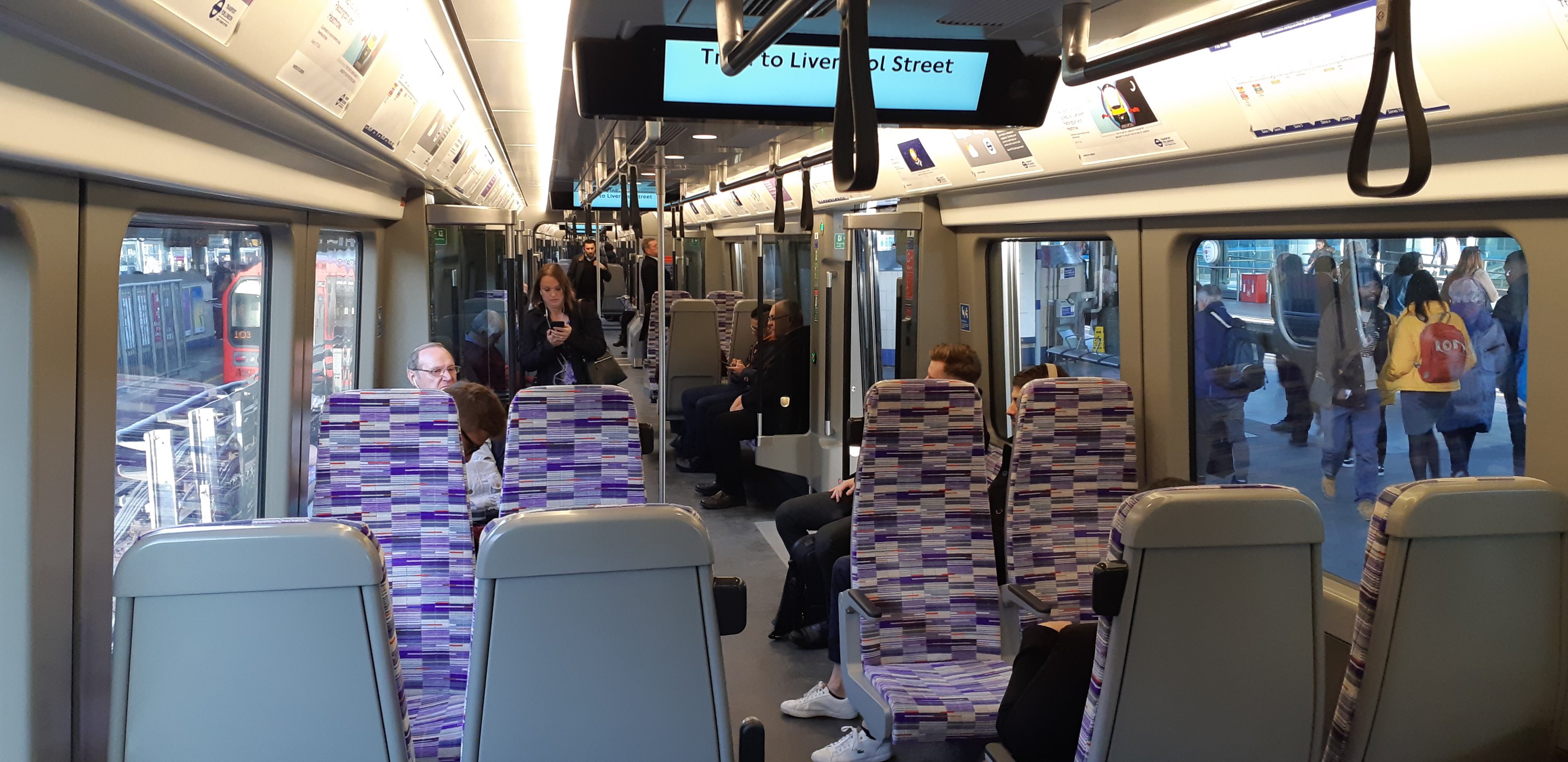 I left the political madness and headed to old haunts out East to see how the Great Eastern suburban service from Liverpool St to Shenfield’s changing now. Having been absorbed into the London Underground a few years ago there’s further changes now. The Class 315s which have been the backbone of the route since 1980 are being replaced by the Bombardier built Class 345s. Only a handful of the new trains were running today, but the writings on the wall for the 315s as several have already headed off to various scrapyards. Mind you, I’m not complaining. The new trains are a lot more comfortable! Here’s what the interior of the 345s looks like.